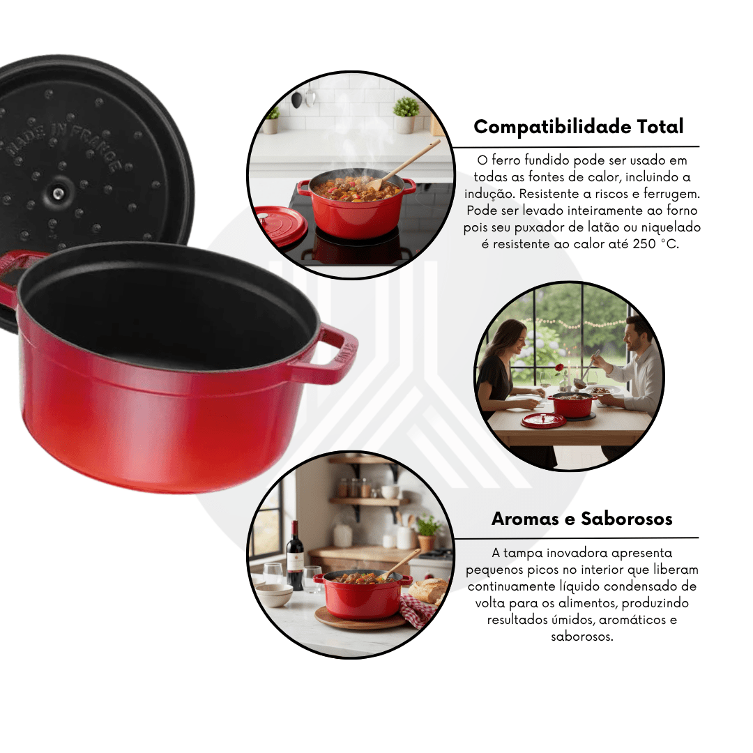O segredo desta peça premium reside na sua performance térmica e na sua tampa. O ferro fundido retém o calor de forma excepcional, mantendo o alimento quente por muito tempo. A inovadora tampa possui o exclusivo sistema de irrigação (picos), que devolve a umidade condensada uniformemente sobre o prato, garantindo resultados suculentos e aromáticos.