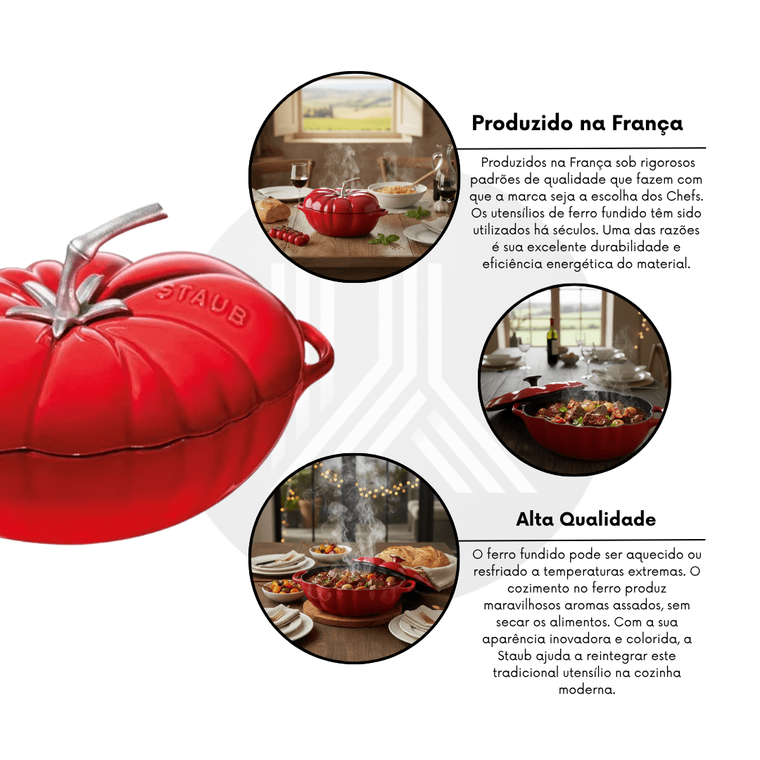 Caçarola STAUB em formato de Tomate é a expressão máxima do luxo e da autêntica experiência de cozinhar. Parte do grupo ZWILLING, a STAUB é a escolha dos maiores Chefs do mundo. Cada peça de ferro fundido esmaltado é produzida na França sob rigorosos padrões de qualidade. Esta edição especial de 25 cm, na cor Cereja, vai além de uma panela: é uma peça de design premium que traz diversão, cor e sabor à sua mesa.