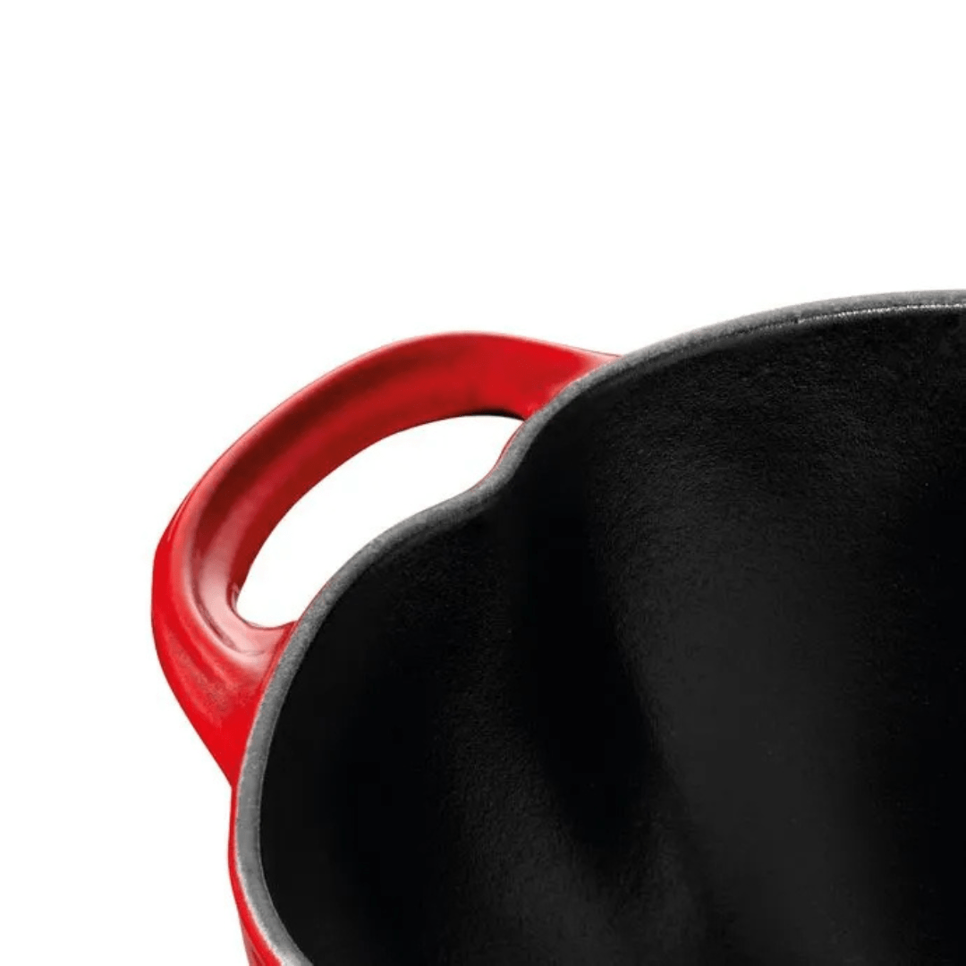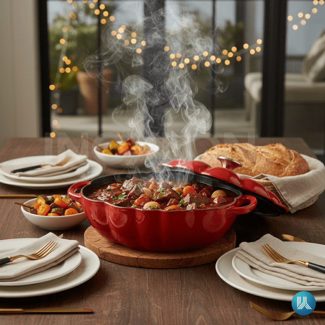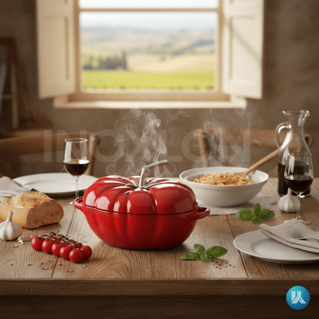 Design de Luxo (Formato de Tomate): Este é o diferencial único. É uma peça de luxo colecionável que resolve o problema de panelas comuns. Ela vai do fogão direto para a mesa como uma elegante travessa de servir, tornando-se o centro das atenções.