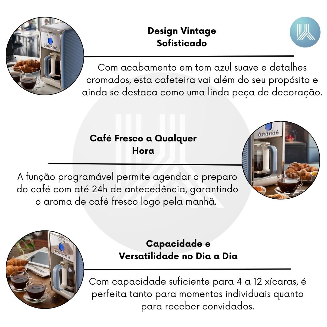 A Cafeteira Vintage Azul da Ariete combina tradição e modernidade em um design encantador. Inspirada no charme das cozinhas italianas retrô, ela traz o equilíbrio perfeito entre elegância estética e praticidade funcional. Com capacidade para até 12 xícaras e programação de preparo automático, transforma o simples ato de fazer café em um ritual de prazer e estilo.