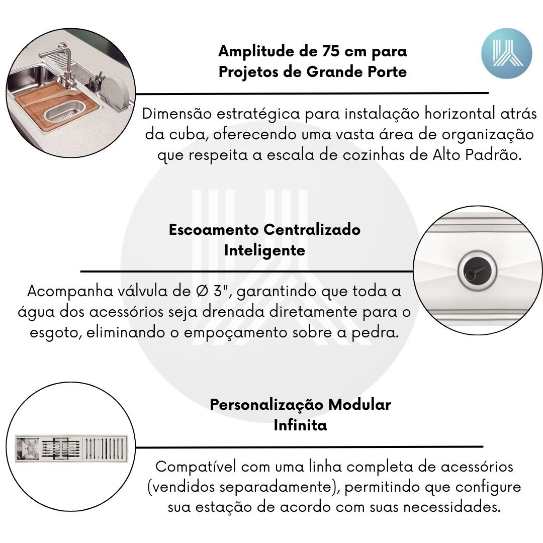 Dimensão estratégica para instalação horizontal atrás da cuba, oferecendo uma vasta área de organização que respeita a escala de cozinhas de Alto Padrão.