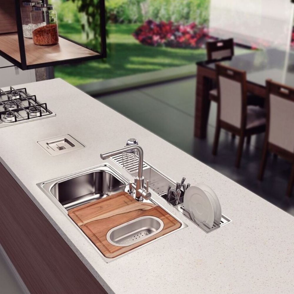 Em cozinhas de Luxo, onde as bancadas gourmet são extensas e o design é protagonista, o uso de escorredores tradicionais sobre a pia torna-se um erro estético que compromete a fluidez do ambiente. O acúmulo de umidade em suportes externos não apenas desvaloriza pedras nobres, como o quartzito e o mármore, mas também gera um ruído visual desnecessário. O Canal Organizador Tramontina de 75 cm é a solução definitiva para este conflito. Ao integrar um sistema linear de drenagem diretamente à arquitetura da bancada, ele permite que a organização da louça e dos alimentos ocorra de forma integrada e discreta, entregando uma Performance Semi-profissional que mantém a área de trabalho sempre livre e impecável.