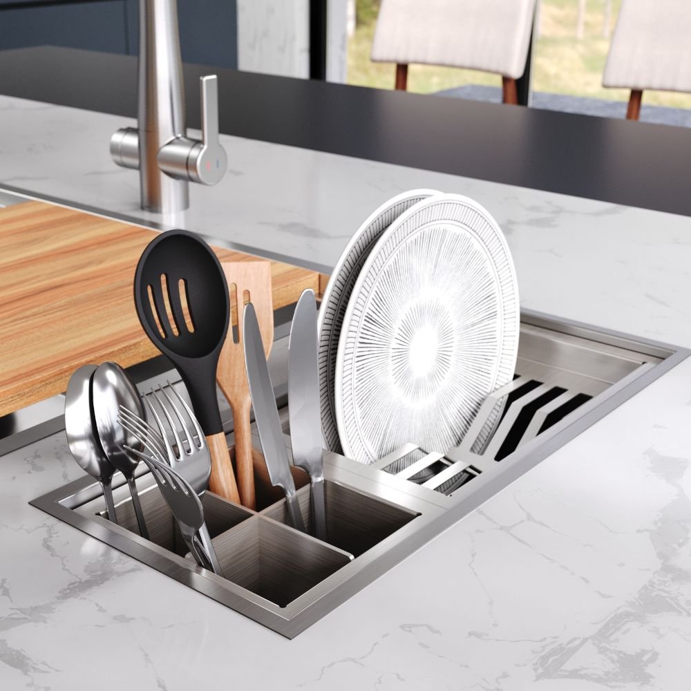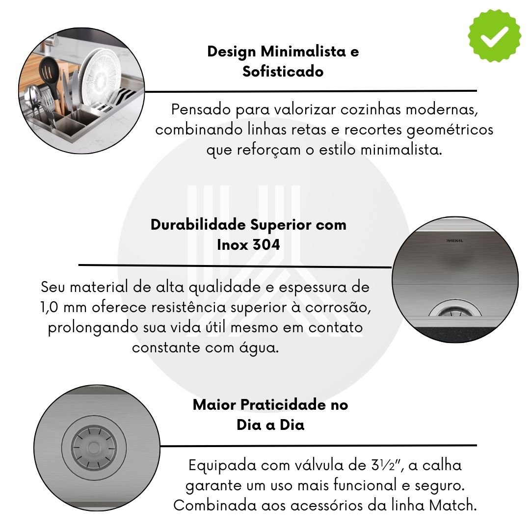 Equipada com válvula de 3½” já inclusa, a calha garante um uso mais funcional e seguro. Combinada aos acessórios da linha Match, proporciona praticidade na rotina da cozinha, permitindo escorrer utensílios, organizar objetos e manter o ambiente limpo. Um investimento que une eficiência, modernidade e estilo em cada detalhe.