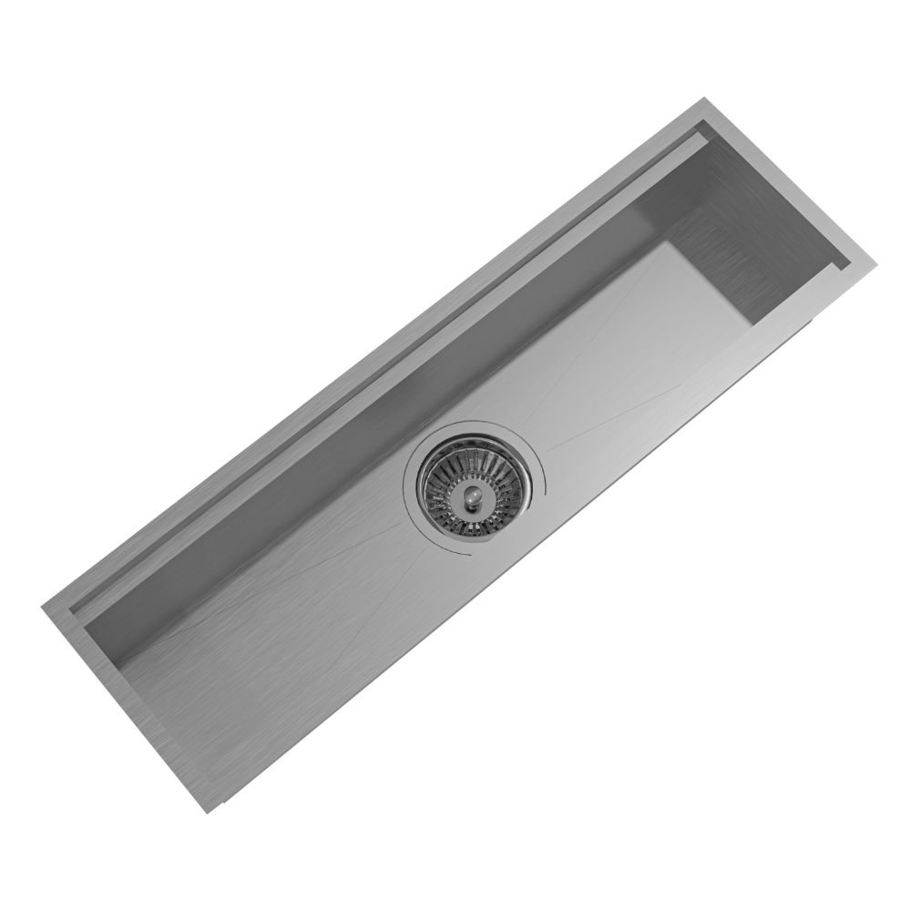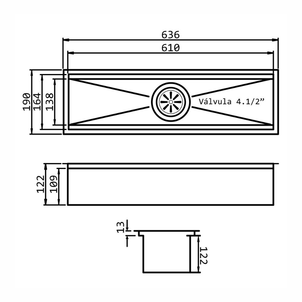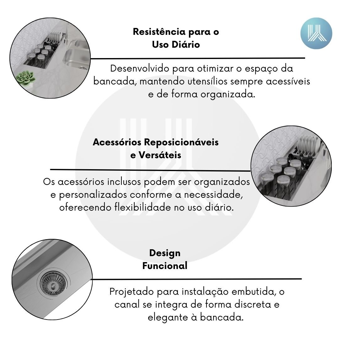 Projetado para instalação embutida, o canal se integra de forma discreta e elegante à bancada. Esse detalhe confere ao ambiente um visual clean e moderno, além de facilitar a manutenção da área de trabalho. O furo de válvula presente no modelo garante escoamento eficiente da água, contribuindo para uma cozinha mais higiênica, prática e organizada.