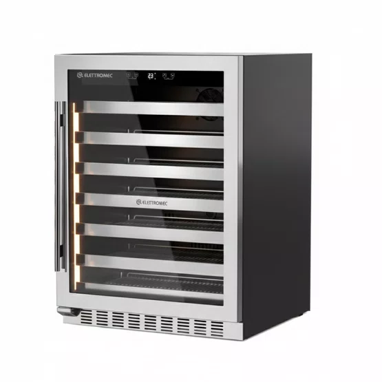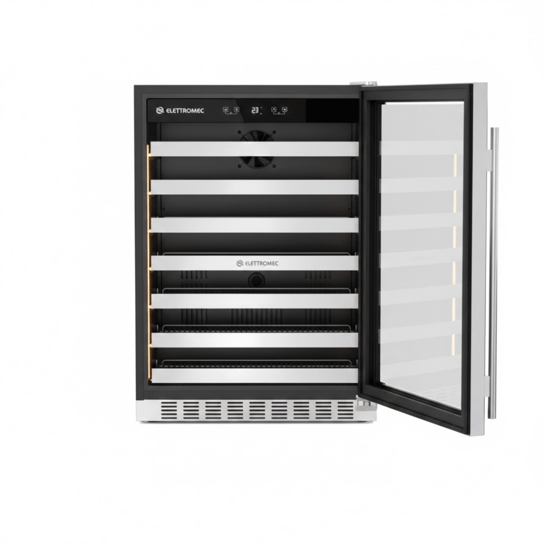 O Beer Center Elettromec Connect de 145 Litros é a solução definitiva em luxo e capacidade para grandes áreas gourmets. Com um espaço interno generoso, este modelo Built-in (de embutir) integra-se perfeitamente à marcenaria, oferecendo um visual imponente. Seu acabamento em Aço Inoxidável 304 (Inox Full Frame) e as prateleiras com frente em inox garantem durabilidade superior e uma estética premium, compondo o "Family Look" perfeito com outros equipamentos da marca. A performance é profissional: o Compressor Inverter garante silêncio absoluto, economia de energia e estabilidade térmica na faixa ideal de -5°C a 5°C, perfeita para todos os estilos de cerveja. A tecnologia é um destaque absoluto, permitindo controlar temperatura, umidade e a iluminação (LED Strip Lateral) diretamente pelo smartphone via aplicativo Elettromec Connect. Para garantir a preservação perfeita das suas cervejas especiais, o Beer Center conta com Vidro Triplo Low-e e tecnologia Heating Glass Duplo (anti-sudação), além de filtro de carvão ativado.