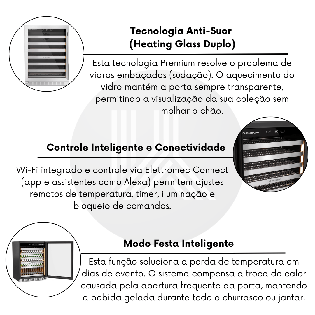 Tecnologia Anti-Suor (Heating Glass Duplo): A porta aquecida soluciona o problema da condensação externa, mantendo o vidro sempre transparente para visualizar a coleção e o chão sempre seco.