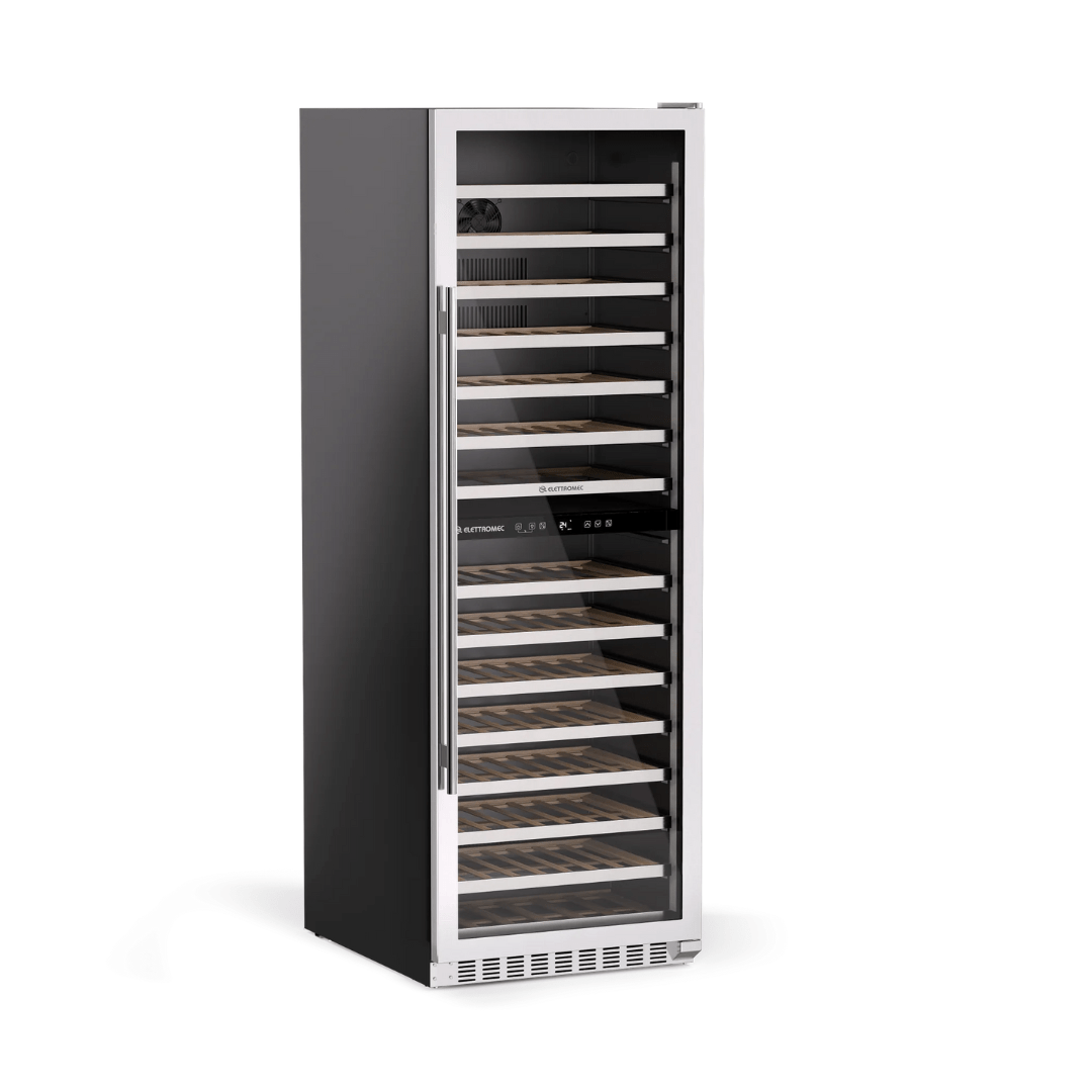 O comando touch moderno e intuitivo permite a operação elegante. O grande diferencial reside nos modos Turbo e Festa, que solucionam o problema da demanda rápida, assegurando resfriamento rápido e temperatura constante mesmo sob uso intenso. A conectividade via aplicativo Elettromec Connect permite controlar luz e temperatura remotamente, e a tecnologia Cut Off Memory elimina o risco de perdas por quedas de energia.