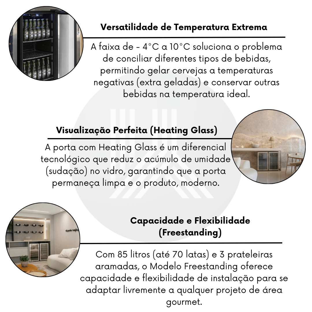 Versatilidade de Temperatura Extrema: A faixa de - 4°C a 10°C soluciona o problema de conciliar diferentes tipos de bebidas, permitindo gelar cervejas a temperaturas negativas (extra geladas) e conservar outras bebidas na temperatura ideal.
