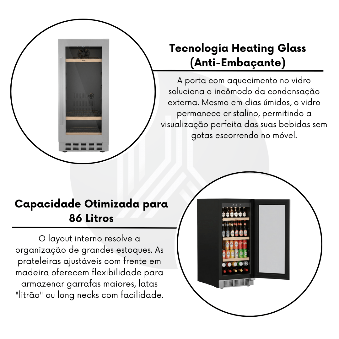 Tecnologia Heating Glass (Anti-Embaçante): A porta com aquecimento no vidro soluciona o incômodo da condensação externa. Mesmo em dias úmidos, o vidro permanece cristalino, permitindo a visualização perfeita das suas bebidas sem gotas escorrendo no móvel.