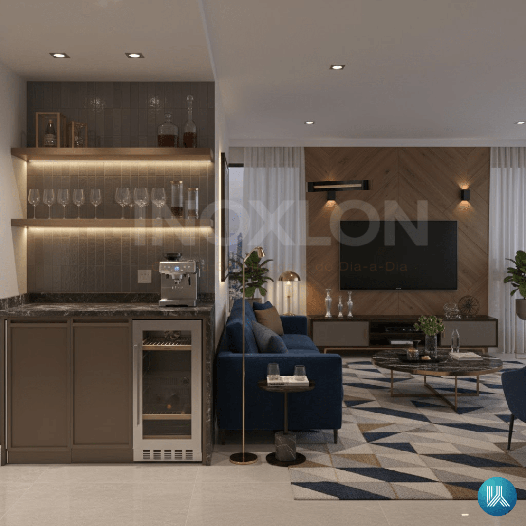 Instalação Built-In com Ventilação Frontal: A Beer Center soluciona a estética do projeto ao ser embutida rente à marcenaria. O design inteligente frontal garante a troca de calor necessária, protegendo a vida útil dos seus armários.