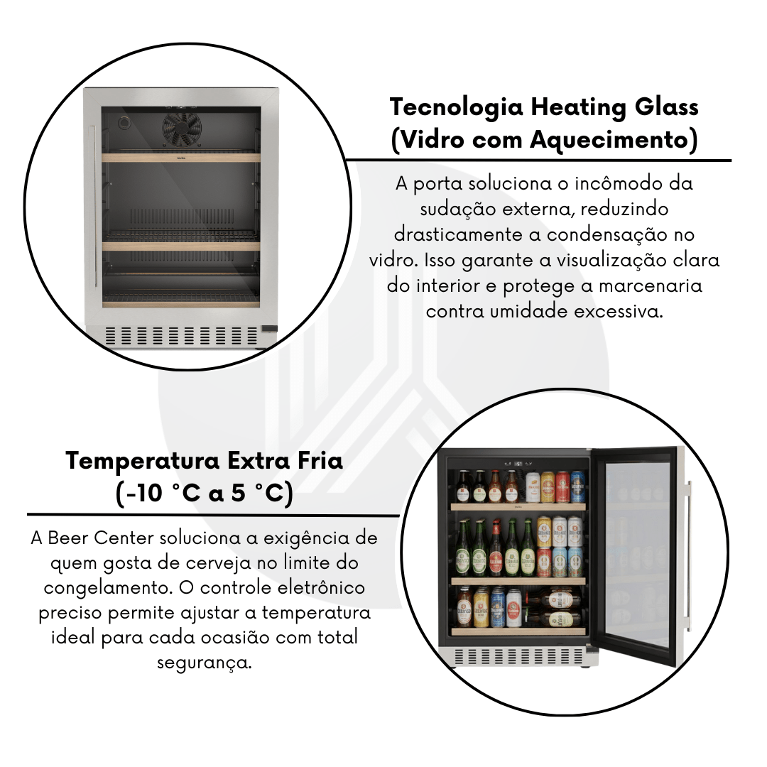 Temperatura Extra Fria (-10 °C a 5 °C): A Beer Center soluciona a exigência de quem gosta de cerveja no limite do congelamento. O controle eletrônico preciso permite ajustar a temperatura ideal para cada ocasião com total segurança.