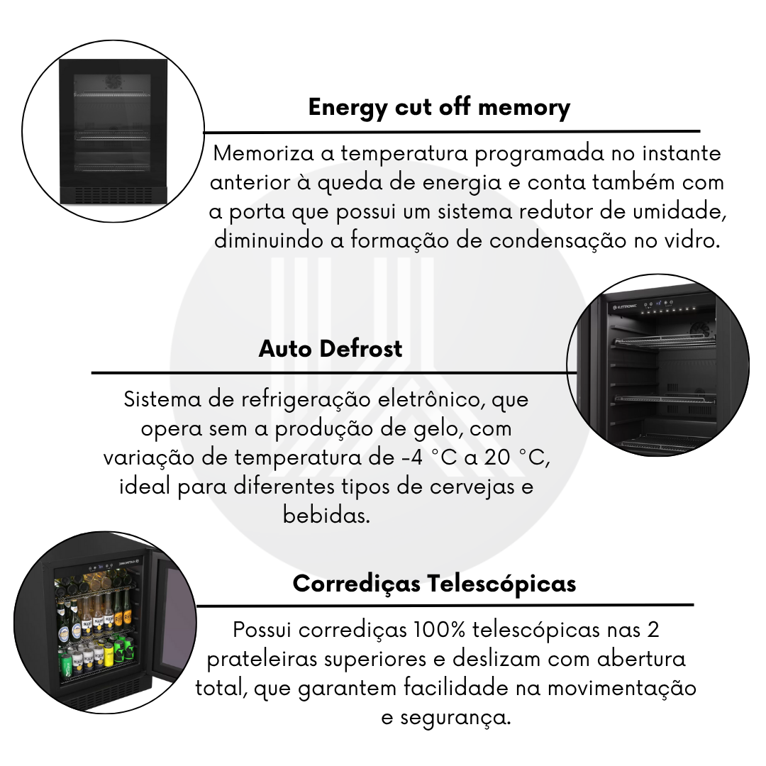 Sistema Anti-Sudação: A porta com sistema redutor de umidade ajuda a evitar o embaçamento do vidro, mantendo a vitrine sempre transparente e limpa (exceto em condições extremas de umidade).