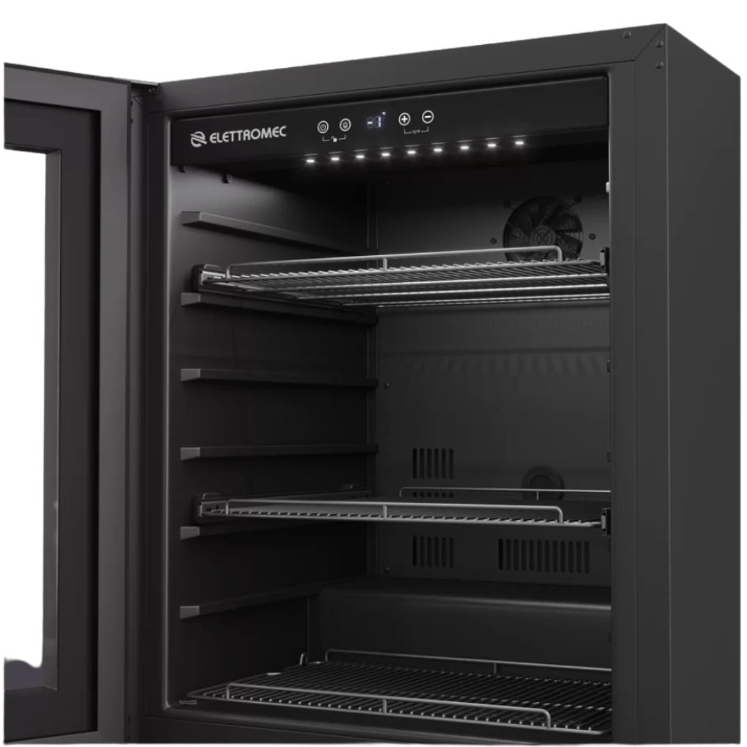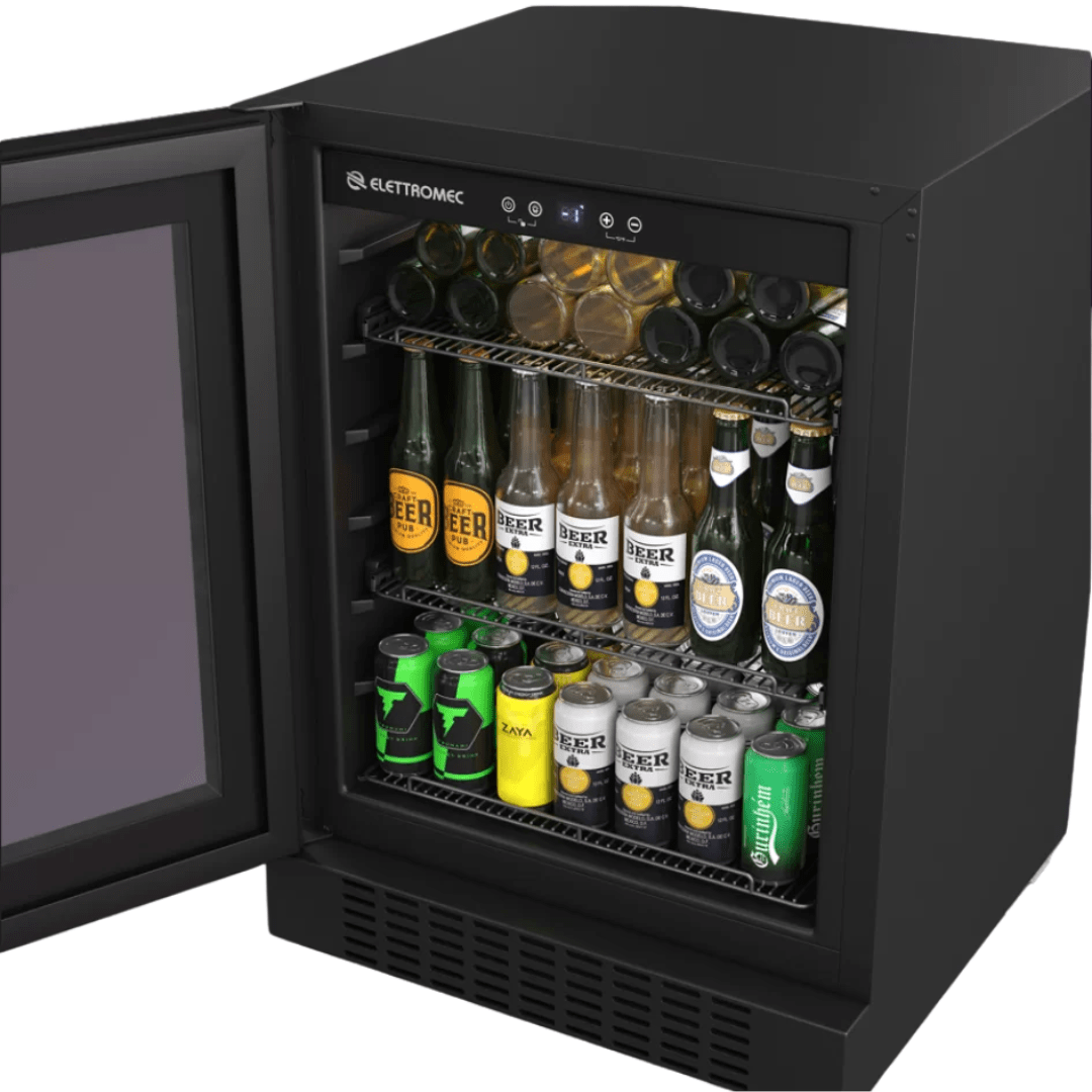 O Beer Center Vetro 144 Litros Built-in da Elettromec é a definição de luxo contemporâneo para áreas gourmets sofisticadas. Com um imponente acabamento frontal em vidro preto temperado, este equipamento foi projetado para se integrar perfeitamente a ambientes modernos, podendo ser instalado nos conceitos Built-in (embutido) ou Undercounter (sob a bancada). Sua estética premium permite a combinação lateral perfeita com a Adega Vetro 40 garrafas, criando um "Family Look" exclusivo. A performance é garantida por um compressor silencioso e um ventilador interno que asseguram uma temperatura homogênea e precisa, variando de -4°C a 20°C, ideal para refrigerar desde cervejas artesanais até refrigerantes e água com rapidez e eficiência. O interior comporta até 184 latas ou 92 garrafas long neck, organizadas em 3 prateleiras, sendo as duas superiores equipadas com corrediças 100% telescópicas para um acesso seguro e suave.