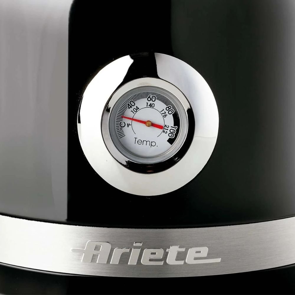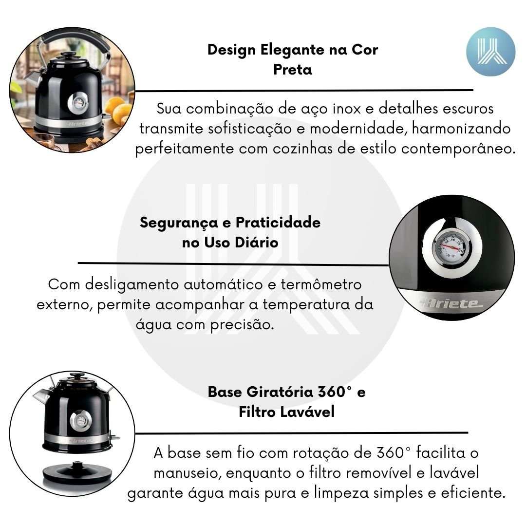 A Ariete Moderna Preta foi desenvolvida para proporcionar total praticidade e segurança. Com desligamento automático e termômetro externo, permite acompanhar a temperatura da água com precisão, enquanto o corpo em aço inoxidável assegura durabilidade. Ideal para preparar suas bebidas preferidas de forma rápida e segura, trazendo conforto e tranquilidade ao seu dia a dia.