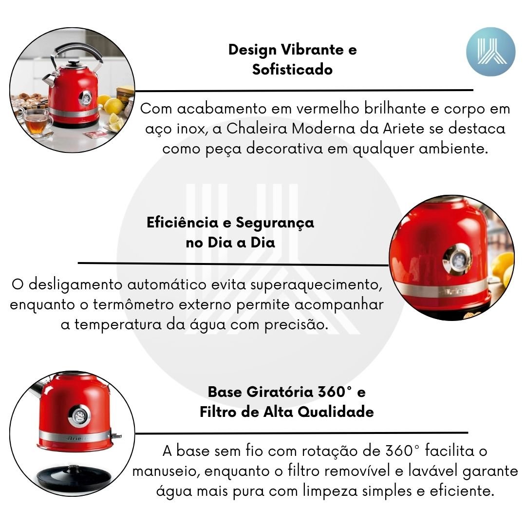 A base sem fio com rotação de 360° oferece total liberdade de movimento, tornando o uso mais prático e ergonômico. O filtro removível e lavável assegura água mais pura e facilita a limpeza diária. Essa combinação de recursos torna a Ariete Moderna Vermelha uma chaleira eficiente, durável e perfeita para quem preza por funcionalidade e elegância.