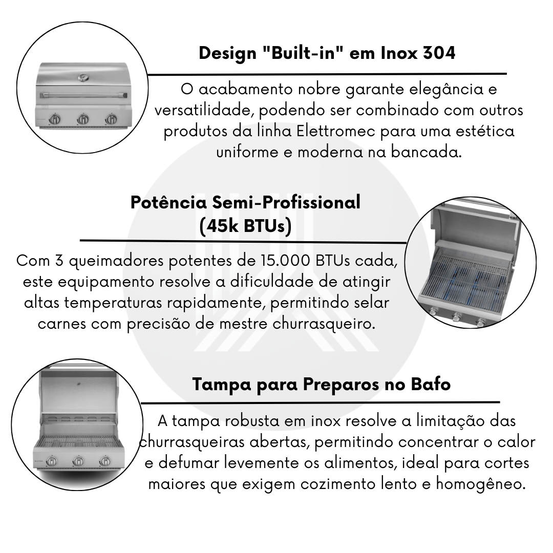 A Churrasqueira a Gás Elettromec de 65 cm é a materialização da potência e sofisticação para áreas externas e varandas gourmets. Projetada para instalação embutida em bancada, ela soluciona o problema da fumaça excessiva e do tempo de espera, oferecendo um aquecimento ultrarrápido através de seus 3 queimadores em flauta que entregam impressionantes 45.000 BTUs no total. Construída integralmente em Aço Inox 304, este modelo garante durabilidade extrema contra corrosão e um design que se integra perfeitamente a projetos arquitetônicos de alto padrão. É um investimento duradouro que une a segurança do acendimento piezoelétrico à versatilidade da tampa para preparos no bafo, garantindo suculência máxima às carnes.