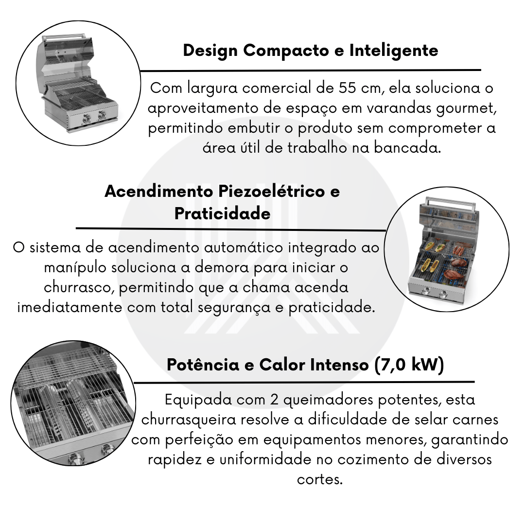 Potência e Calor Intenso (7,0 kW): Equipada com 2 queimadores potentes, esta churrasqueira resolve a dificuldade de selar carnes com perfeição em equipamentos menores, garantindo rapidez e uniformidade no cozimento de diversos cortes.