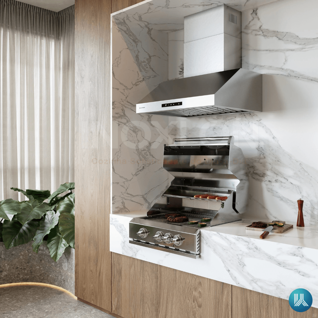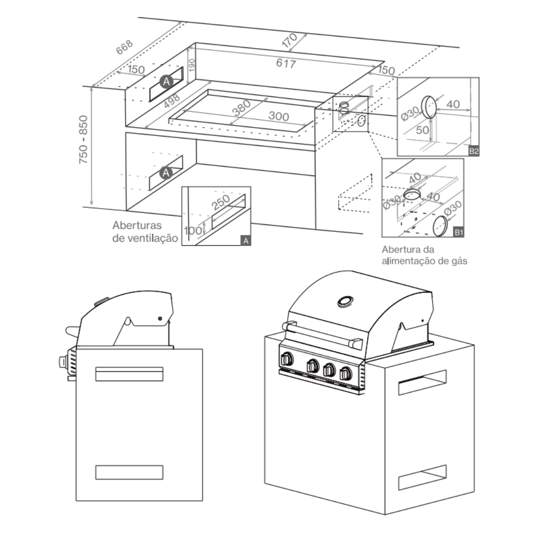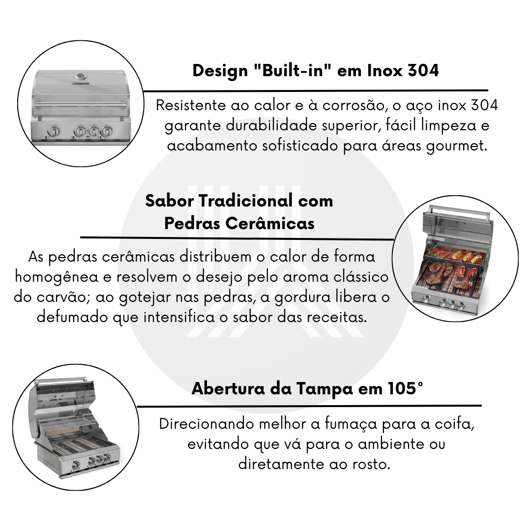 Ergonomia e Dispersão de Fumaça (105°): A tampa com abertura em 105° resolve o desconforto térmico durante o manuseio, direcionando a fumaça de forma mais eficiente para a coifa e protegendo o mestre churrasqueiro.