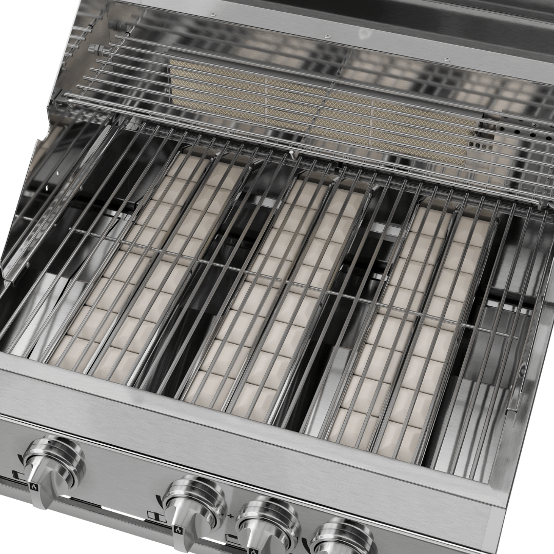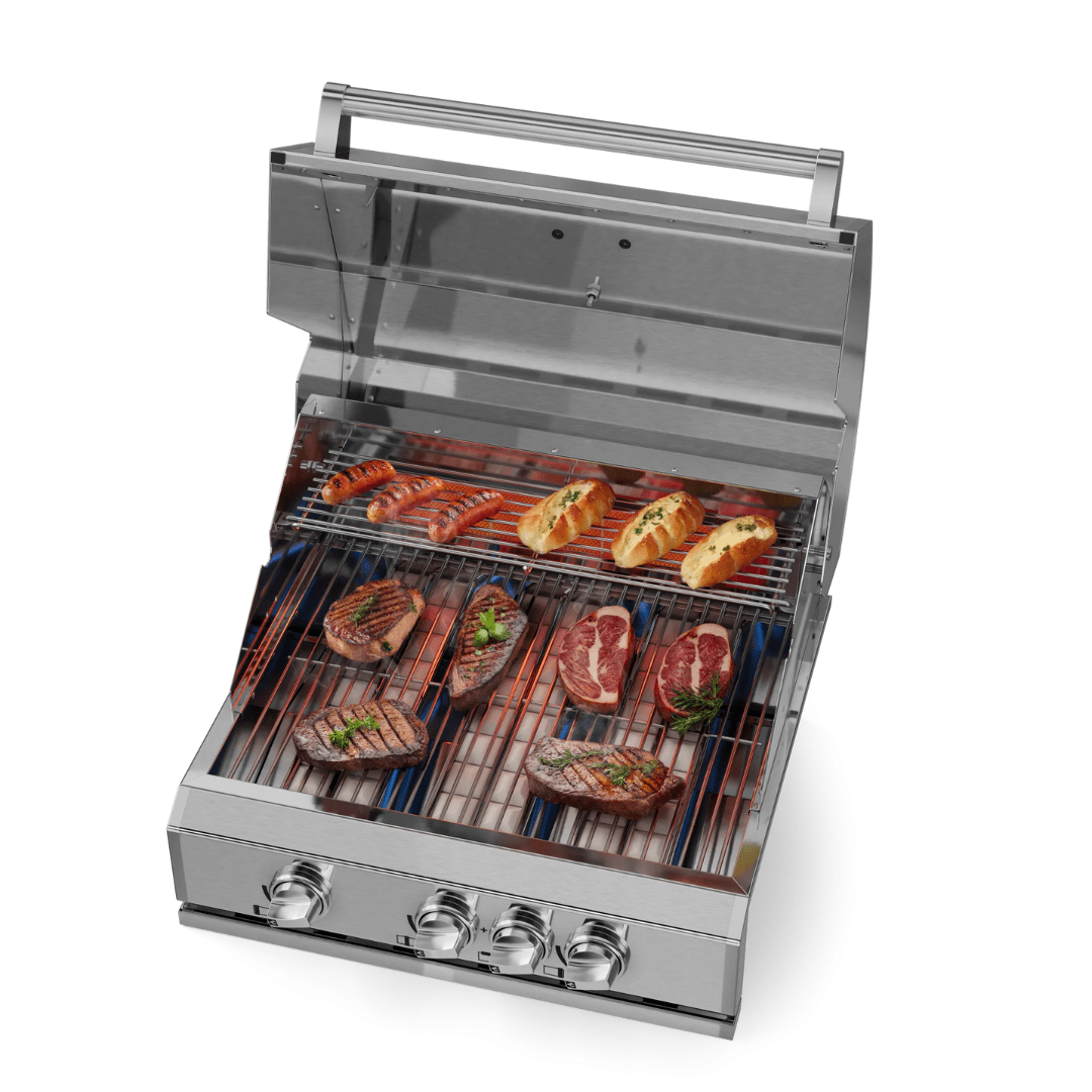 Potência Versátil (14,0 kW): Equipada com 4 queimadores potentes (3,5 kW cada), esta churrasqueira resolve a dificuldade de preparar diferentes cortes simultaneamente, permitindo criar zonas de calor independentes para carnes, vegetais e pães.