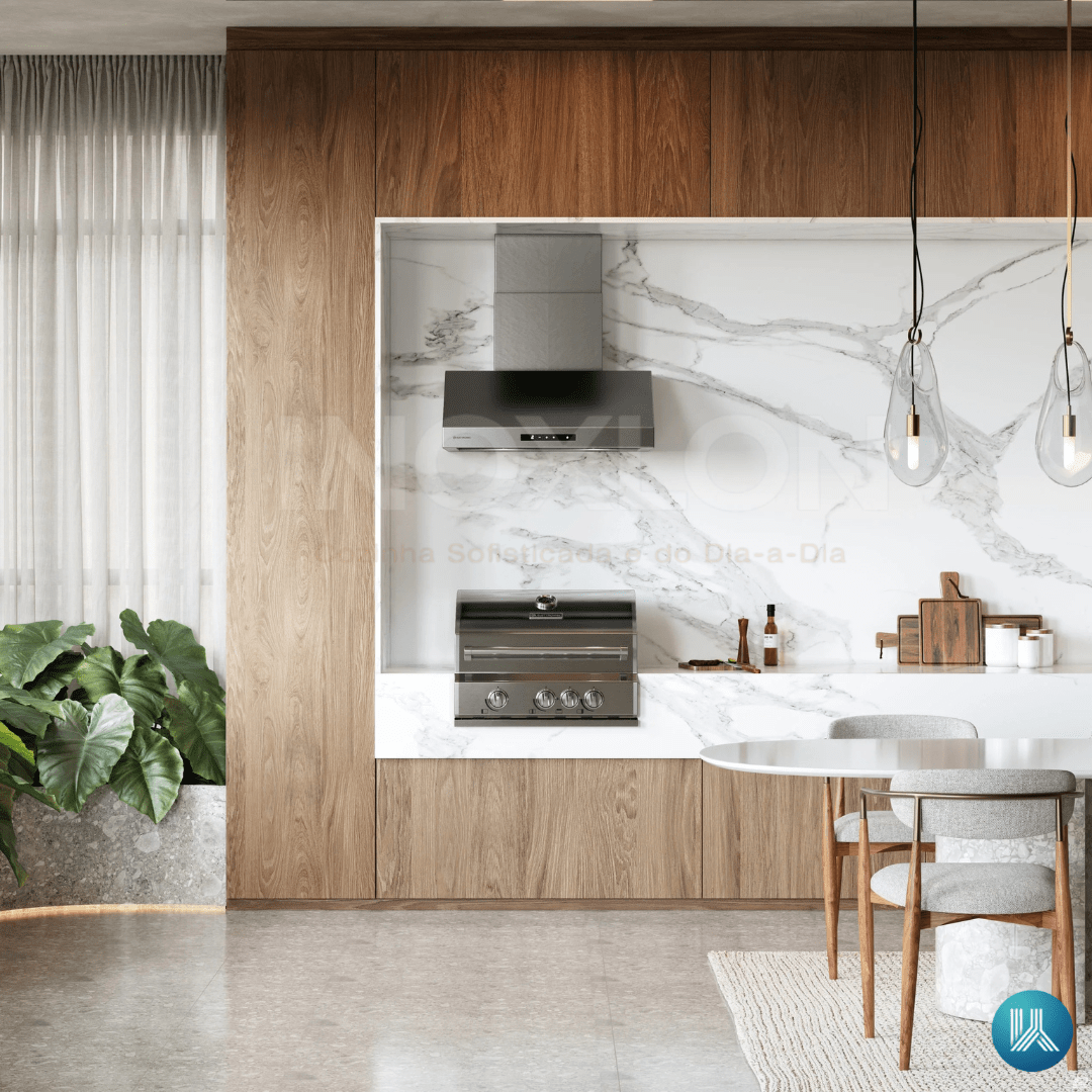 A Churrasqueira Inox Gás 65 cm é a materialização do desempenho gourmet em um design inteligente e sofisticado. Projetada para embutir, ela soluciona a necessidade de uma estação de churrasco completa, oferecendo uma potência total de 14,0 kW distribuída em 4 queimadores de alta performance. Este modelo destaca-se pela tecnologia do Queimador Infrared Traseiro, que garante selagens impecáveis e cocção uniforme, e pelo uso de Pedras Cerâmicas, que reproduzem o sabor autêntico do churrasco a carvão. É um investimento duradouro em aço inox 304, garantindo resistência à corrosão e um visual integrado que harmoniza perfeitamente com cozinhas e varandas de alto padrão.