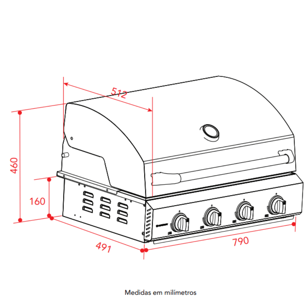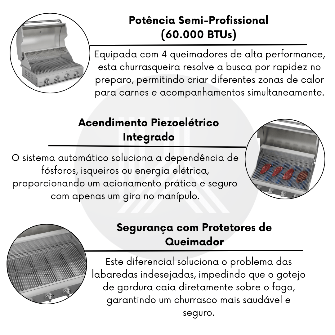 Potência Semi-Profissional (60.000 BTUs Total): Equipada com 4 queimadores de alta performance, esta churrasqueira resolve a busca por rapidez no preparo, permitindo criar diferentes zonas de calor para carnes e acompanhamentos simultaneamente.