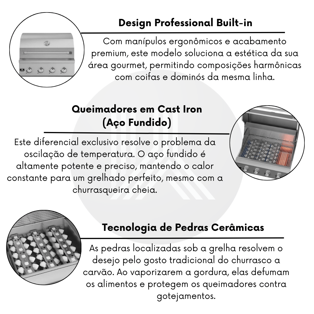 Tecnologia de Pedras Cerâmicas: As pedras localizadas sob a grelha resolvem o desejo pelo gosto tradicional do churrasco a carvão. Ao vaporizarem a gordura, elas defumam os alimentos e protegem os queimadores contra gotejamentos.