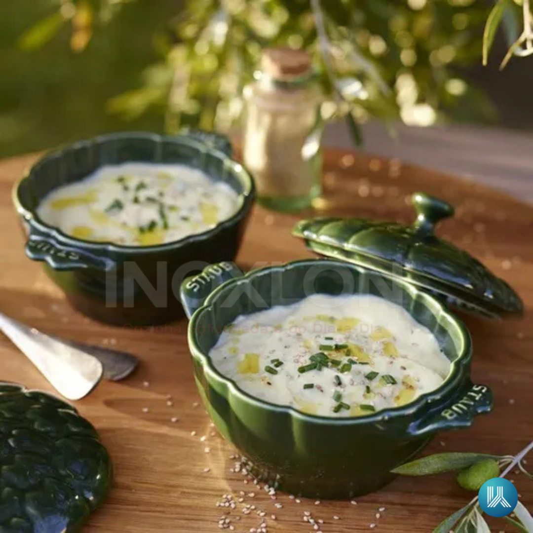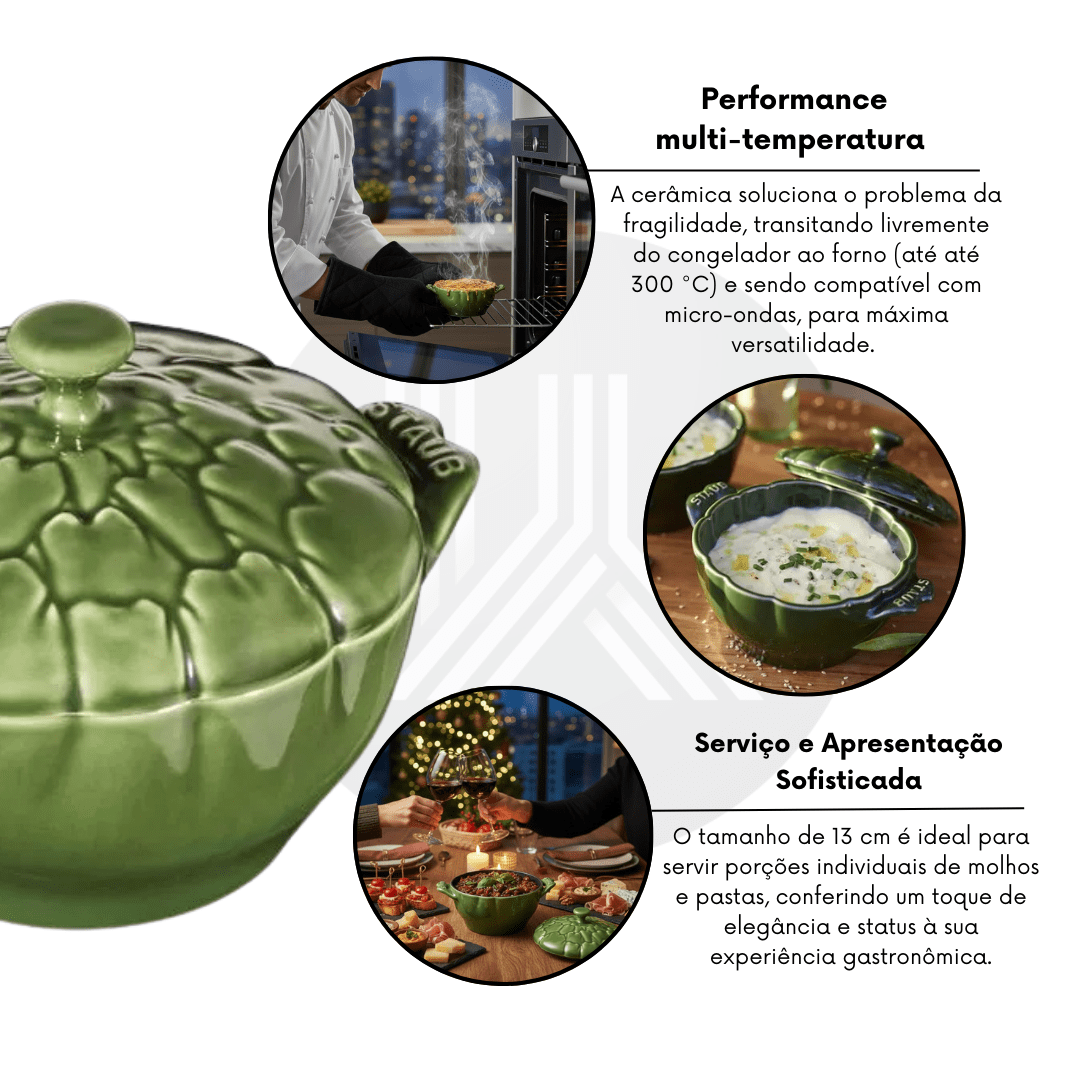 Status e Design de Destaque (Alcachofra): Adquira uma peça da grife francesa STAUB com formato exclusivo de alcachofra, um diferencial de luxo que eleva a decoração da sua mesa e transforma o ato de servir em um ritual.