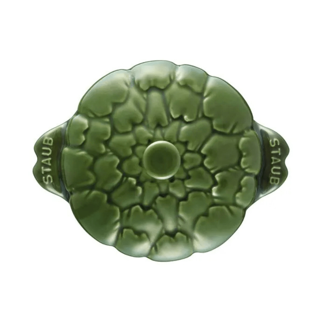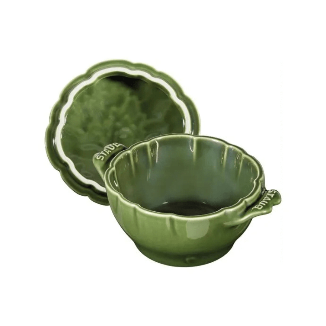 Cocotte de Cerâmica STAUB Alcachofra 13 cm. Esta peça miniatura de design exclusivo da STAUB, uma marca francesa renomada por seu legado de excelência, transforma o ato de servir em uma experiência sofisticada e memorável, sendo um verdadeiro investimento duradouro em charme e funcionalidade para sua cozinha gourmet.