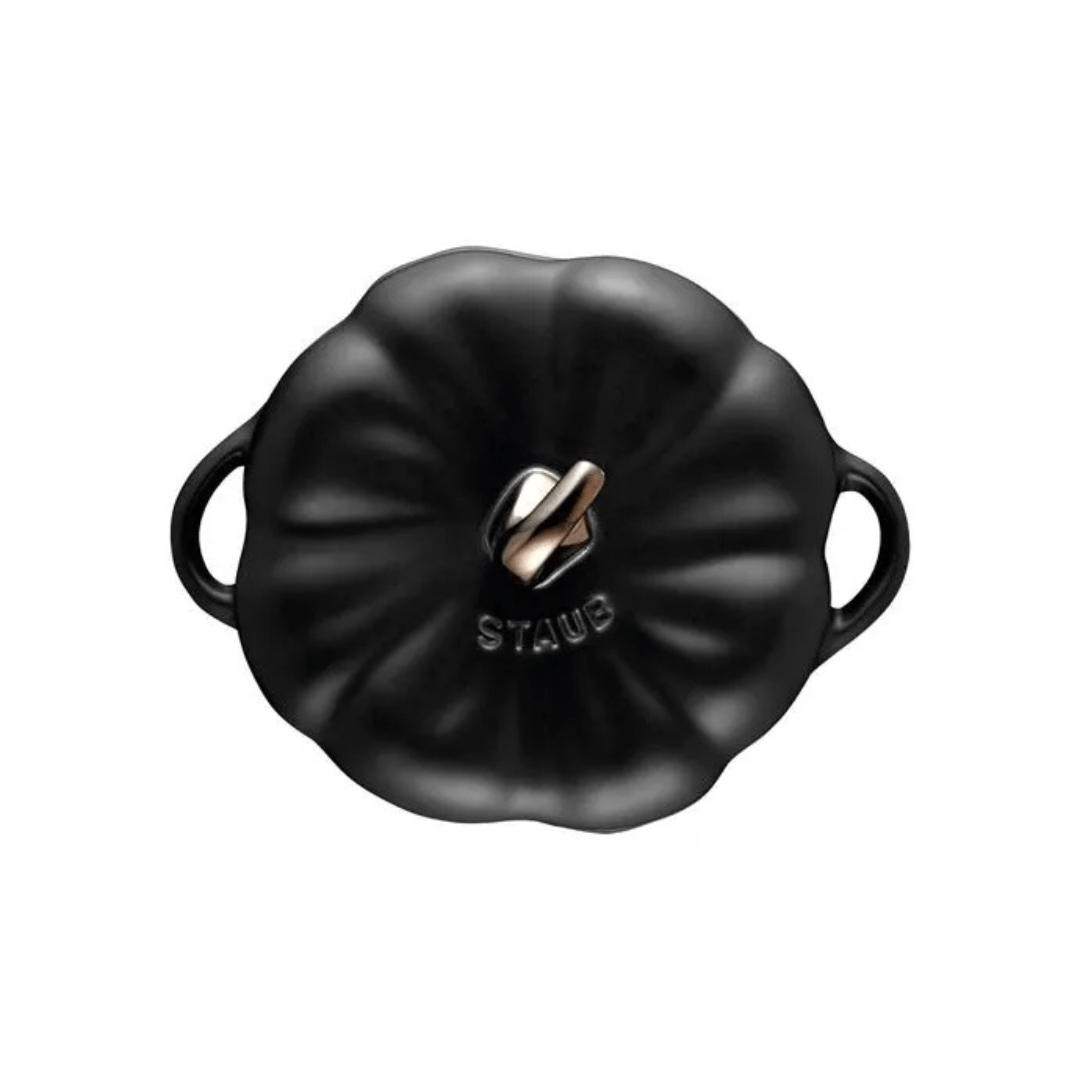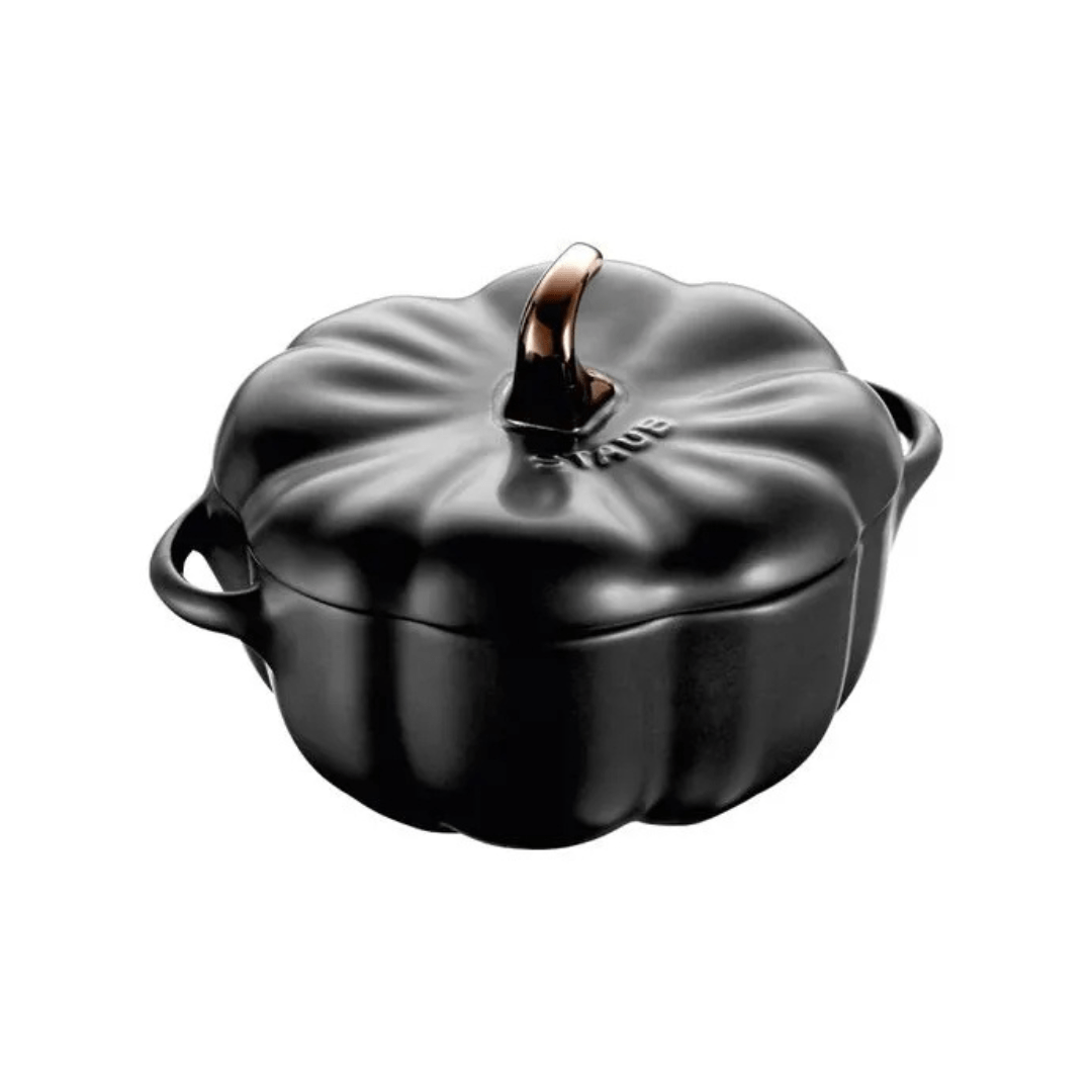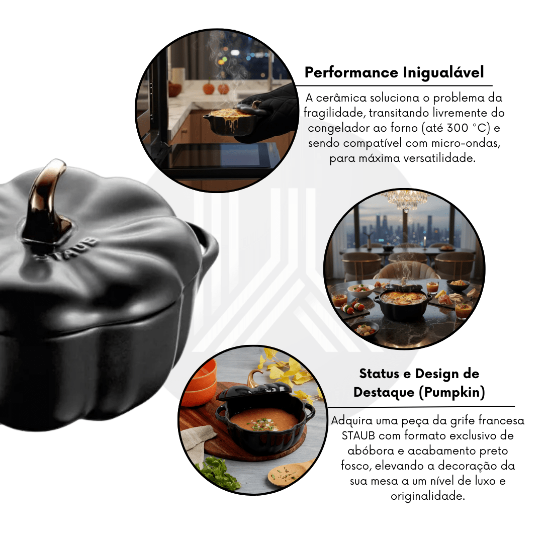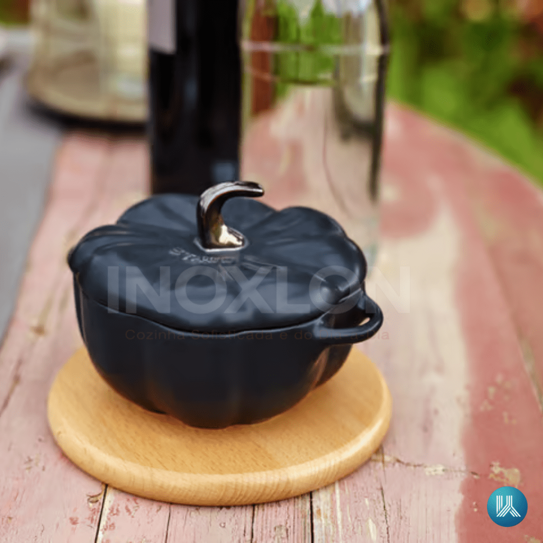 Status e Design de Destaque (Pumpkin): Adquira uma peça da grife francesa STAUB com formato exclusivo de abóbora e acabamento preto fosco, elevando a decoração da sua mesa a um nível de luxo e originalidade.