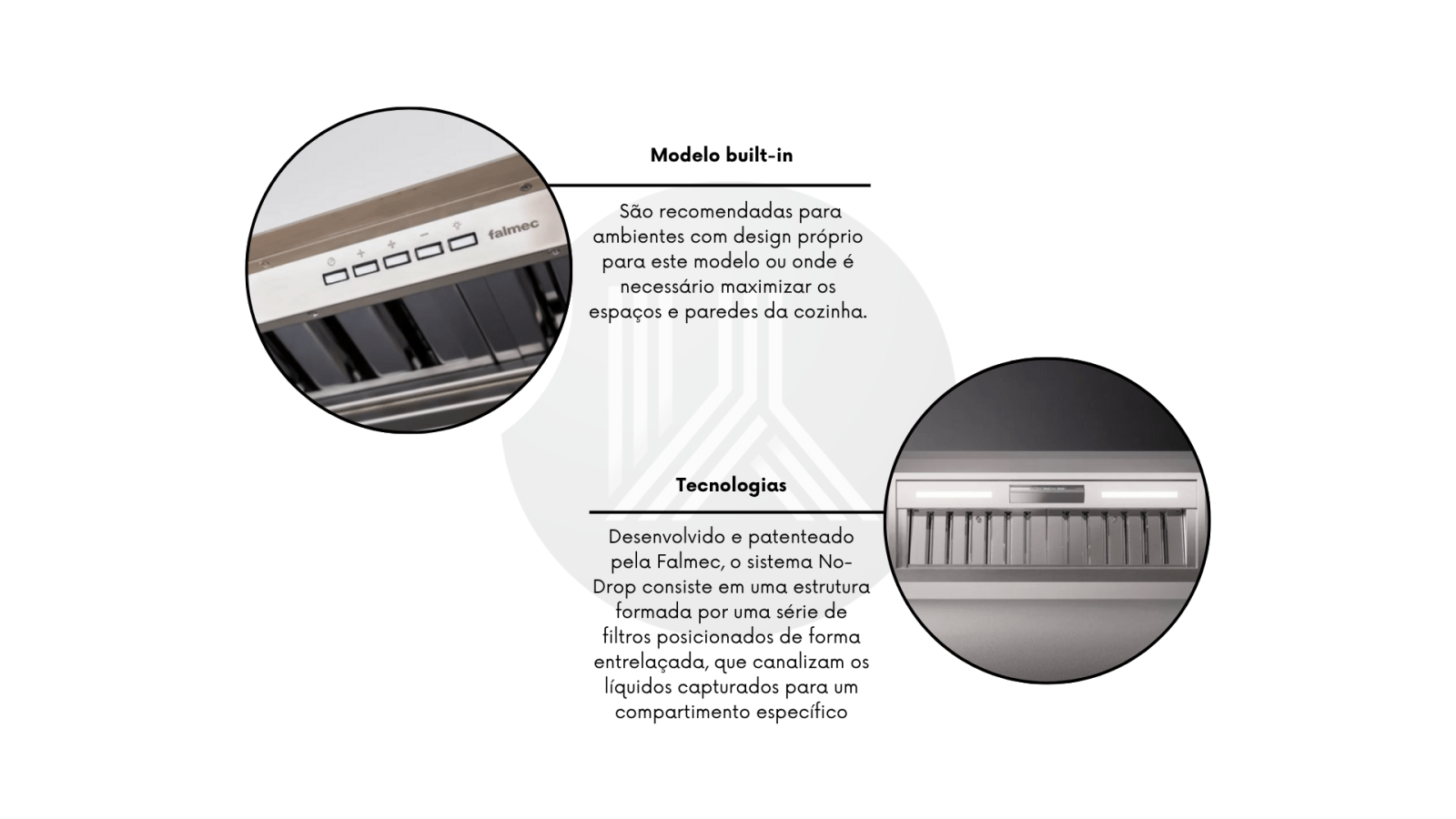 A Coifa Embutida Falmec com Sistema No-Drop é ideal para quem busca aliar tecnologia, eficiência e estética refinada. Com design Built-in e acabamento em aço inoxidável 304 com película protetora, ela se adapta perfeitamente a cozinhas planejadas, oferecendo alta capacidade de sucção mesmo em ambientes fechados. Seu exclusivo sistema No-Drop patenteado evita o gotejamento causado pela condensação dos vapores, garantindo bancadas sempre secas e limpas. Um verdadeiro destaque em funcionalidade e integração arquitetônica.