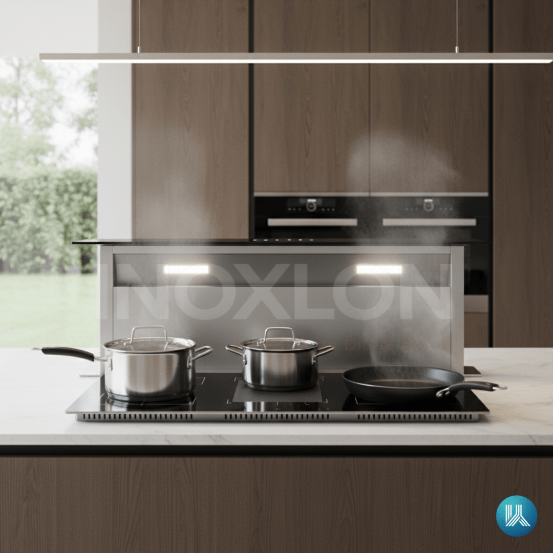 A Coifa de Bancada Elettromec Downdraft Sollevare redefine o conceito de cozinhas minimalistas e tecnológicas. Este modelo downdraft de 90 cm foi projetado para ser totalmente embutido na bancada, ficando perfeitamente oculto quando não está em uso e elevando-se com um toque. É a solução definitiva para espaços com pé direito alto, ilhas centrais ou projetos onde uma coifa de teto não é uma opção, garantindo um design sofisticado e livre de obstruções visuais.