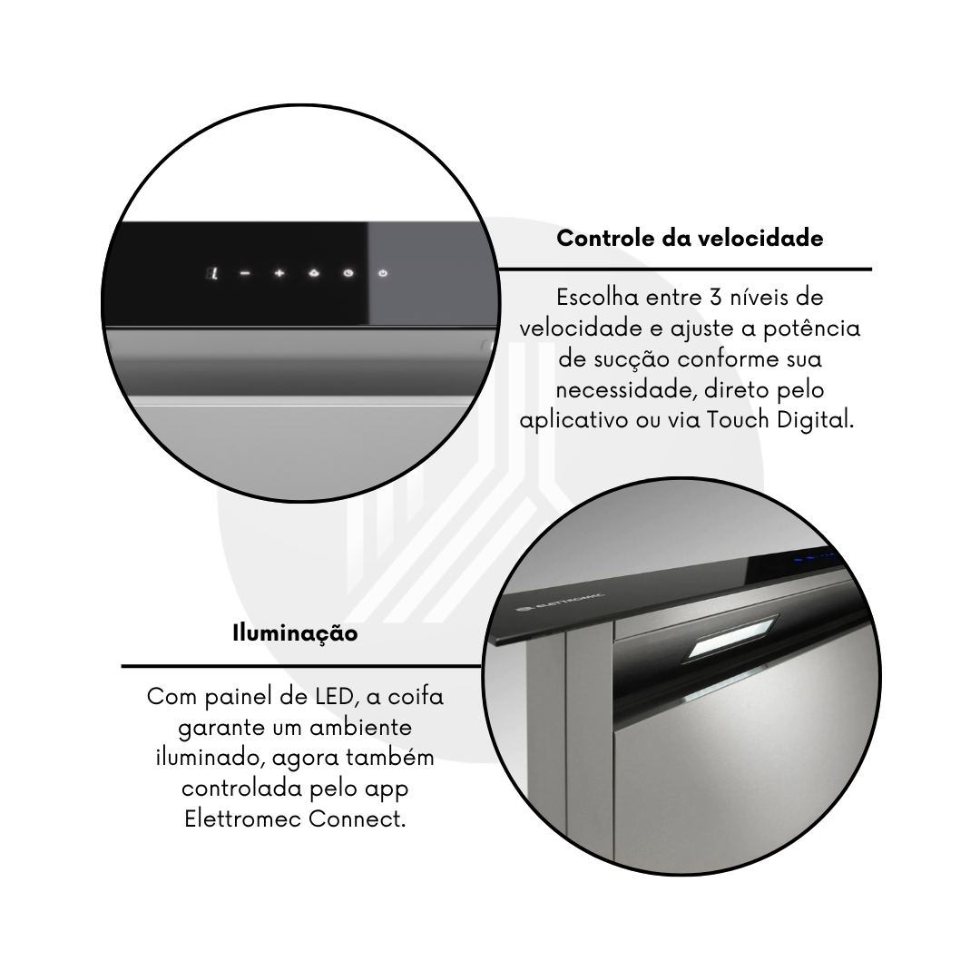 Seu design alia minimalismo com a tecnologia Connect, com a qual você pode acionar sua coifa diretamente pelo celular. Ela conta com 1.200m³/h de vazão, com 3 velocidades de uso, iluminação em LED, aspiração perimetral e timer. Mesmo sendo um item discreto, a coifa downdraft Sollevare com certeza será o centro das atenções em sua cozinha.
