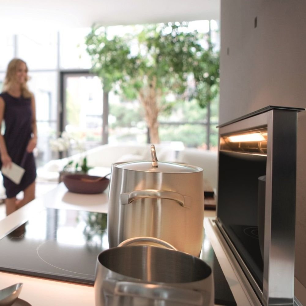O design ultra-slim do modelo DownDraft permite uma instalação totalmente embutida na bancada, garantindo um visual limpo e moderno. Sua versatilidade é um grande diferencial, pois a coifa pode ser instalada tanto no formato ilha quanto em parede, adaptando-se a diversos layouts de cozinha e alinhando-se com a estética de produtos premium.