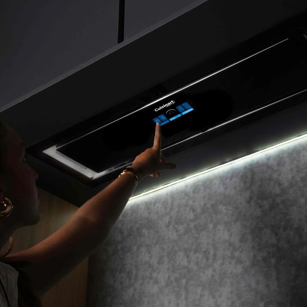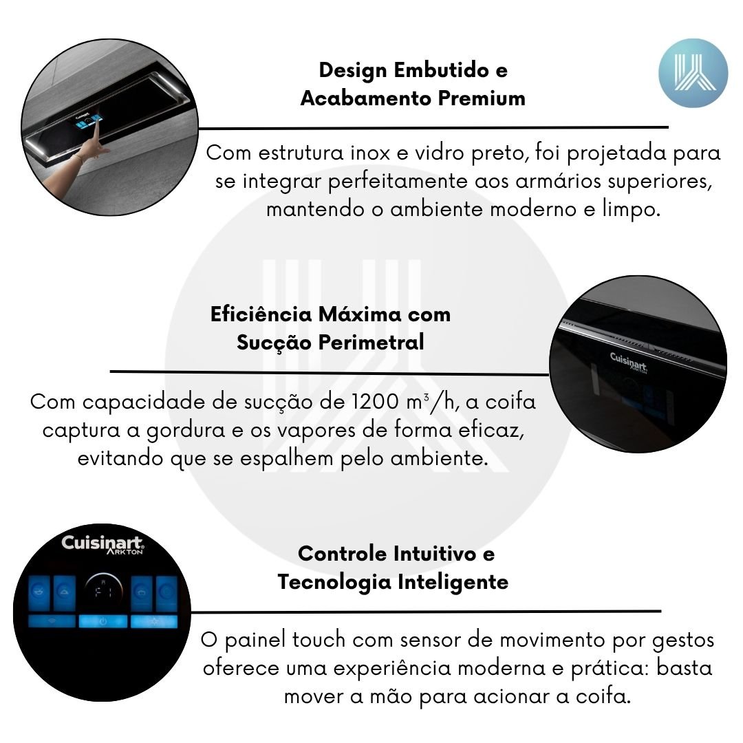 A Coifa de Embutir Arkton Advanced 90 cm da Cuisinart une design sofisticado, tecnologia inteligente e alta performance, ideal para cozinhas planejadas que valorizam funcionalidade e estética premium. Com acabamento em aço inox e vidro preto, o modelo entrega um visual contemporâneo e discreto, integrando-se perfeitamente ao mobiliário. Sua potência de 1200 m³/h garante eficiência na eliminação de odores, vapores e gordura, mesmo em preparos mais intensos.