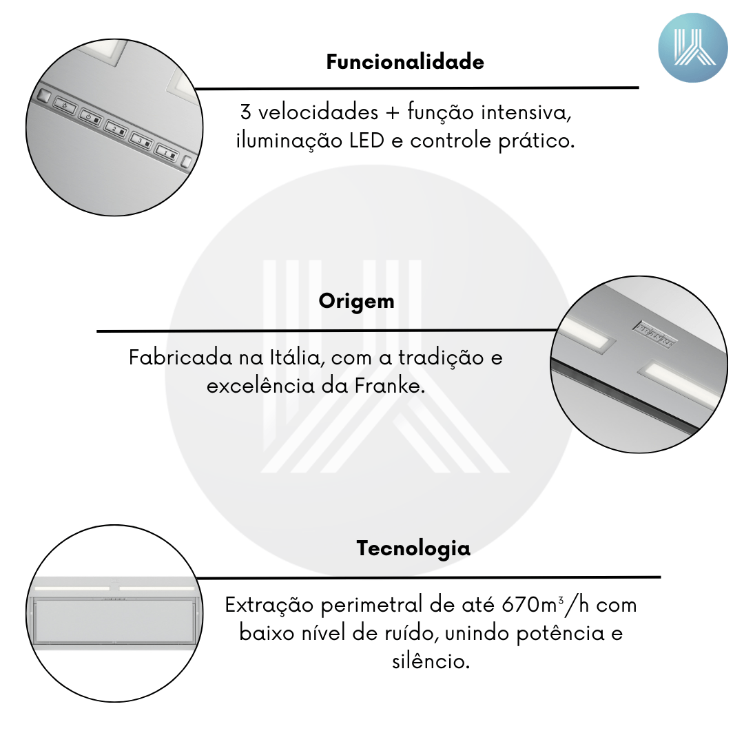 Alto Desempenho: Extração perimetral de até 670m³/h (IEC), com 3 velocidades + intensiva, garantindo eficiência contra odores e vapores.
