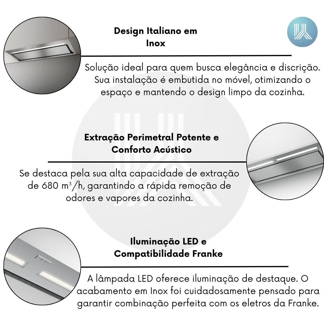 O produto possui uma lâmpada LED que oferece iluminação de destaque e facilita o preparo dos alimentos. O acabamento Inox foi cuidadosamente pensado para garantir uma combinação perfeita com os cooktops e outros eletros da Franke, assegurando um visual de cozinha planejada com alta coerência estética e funcional.