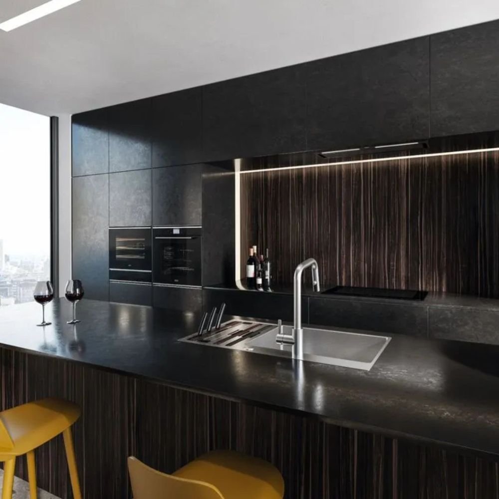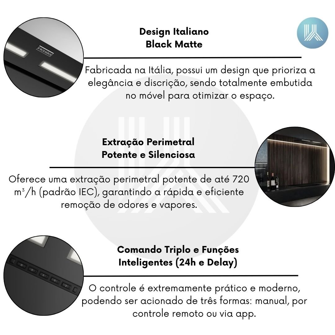 Fabricada na Itália, a coifa FBFP Black Matte (preto fosco) de 86 cm possui um design que prioriza a elegância e discrição, sendo totalmente embutida no móvel para otimizar o espaço. O acabamento inox preto fosco é moderno, facilita a limpeza e harmoniza-se perfeitamente com a estética de outros eletrodomésticos da linha Franke Maris.