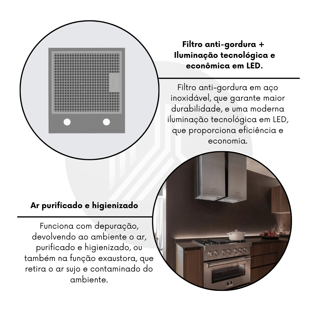 A tecnologia da Proteus une facilidade de uso e flexibilidade total. O controle intuitivo é feito pelo comando Soft Touch, que permite selecionar uma das 3 velocidades ou acionar a moderna iluminação em LED com apenas um leve toque. Projetada para se adaptar a qualquer projeto, ela opera com máxima eficiência tanto no modo Exaustor (retirando o ar contaminado do ambiente) quanto no modo Depurador (recirculando o ar filtrado e purificado). Para otimizar a sucção, recomenda-se ligar a coifa na velocidade máxima 3 a 5 minutos antes de iniciar o preparo e mantê-la ligada pelo mesmo período após o término.