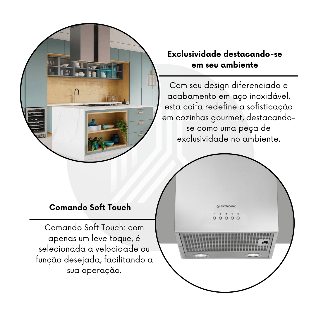 A Coifa de Ilha Elettromec Proteus redefine a sofisticação em cozinhas gourmet, apresentando um design imponente e minimalista em linhas retas de aço inox. Embora seu perfil slim de apenas 35 cm seja ideal para espaços reduzidos, sua performance é máxima, entregando uma potente vazão livre de 1.200 m³/h que garante um ambiente livre de odores e fumaça. O destaque absoluto fica por conta da sua versatilidade única: o projeto da Proteus permite a instalação de duas unidades lado a lado com o mínimo de 5 cm de distancia de uma para outra, criando um conjunto visualmente impactante para bancadas maiores e duplicando o poder de extração.