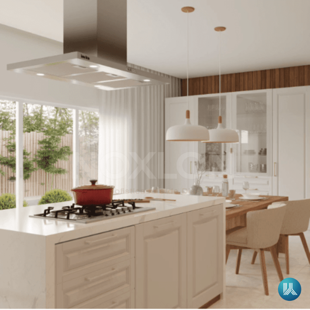 Design Premium Ilha 90 cm: A largura ideal de 90 cm com Aspiração Central e Acabamento em Aço Inoxidável eleva o status da peça, integrando-se harmoniosamente à ilha.