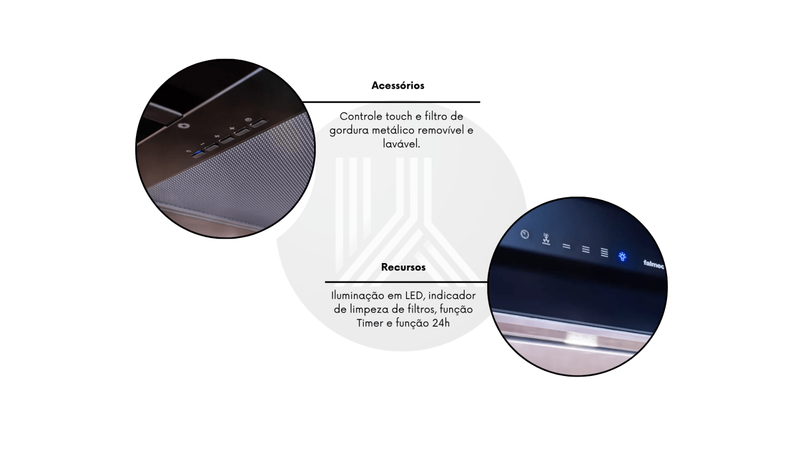 Iluminação em LED com Indicador de Limpeza de Filtro: Garante visibilidade ideal durante o preparo dos alimentos e sinaliza quando é hora de limpar os filtros;