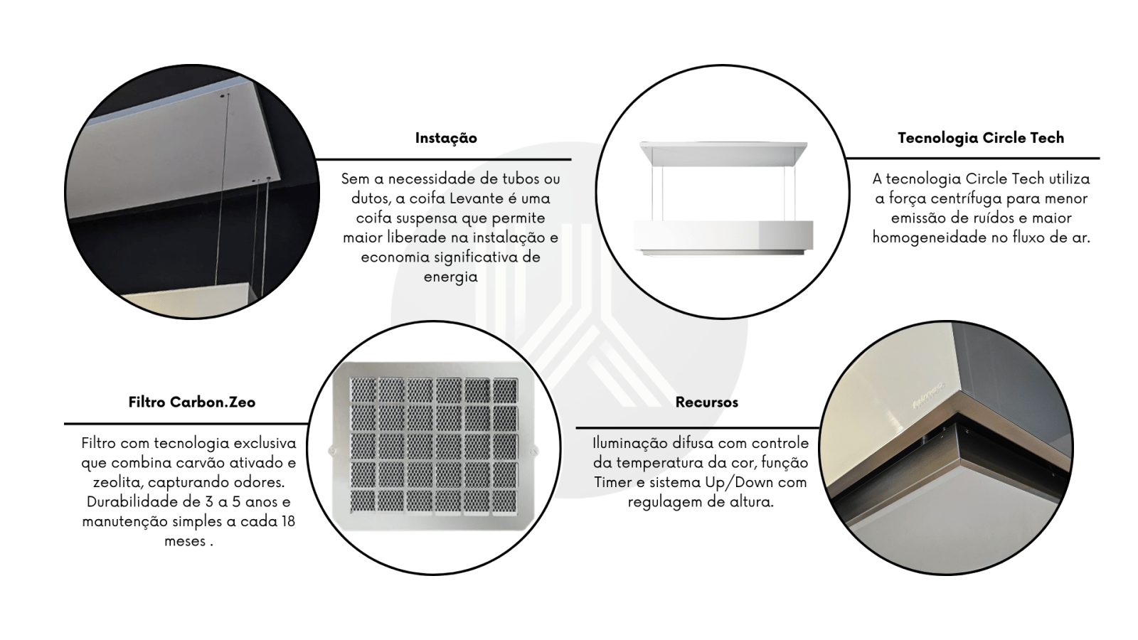 Tecnologia Circle Tech: Sistema exclusivo que combina extração e filtragem em um único elemento, utilizando força centrífuga para reduzir ruídos e otimizar o fluxo de ar, resultando em filtragem máxima com baixo impacto visual;