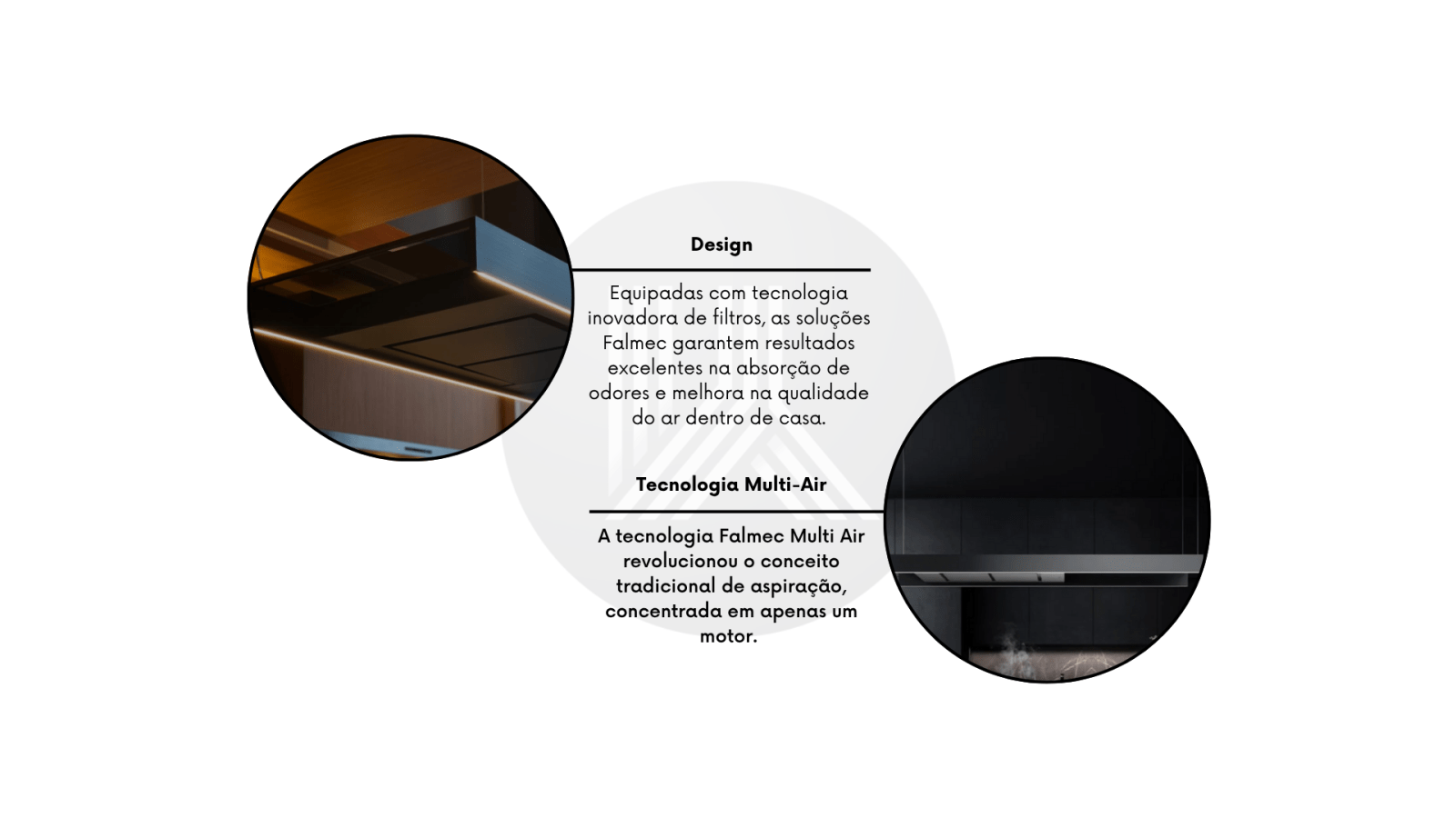 A Coifa Suspensa Falmec Multi-Air é a escolha ideal para quem busca unir um design premiado internacionalmente com alta performance em purificação do ar. Com estrutura em alumínio e acabamento em aço inox com pintura preto fosco, ela oferece aspiração perimetral e tecnologia exclusiva que elimina a necessidade de dutos. Compacta, silenciosa e sofisticada, é perfeita para cozinhas integradas e ambientes gourmet com estética moderna.