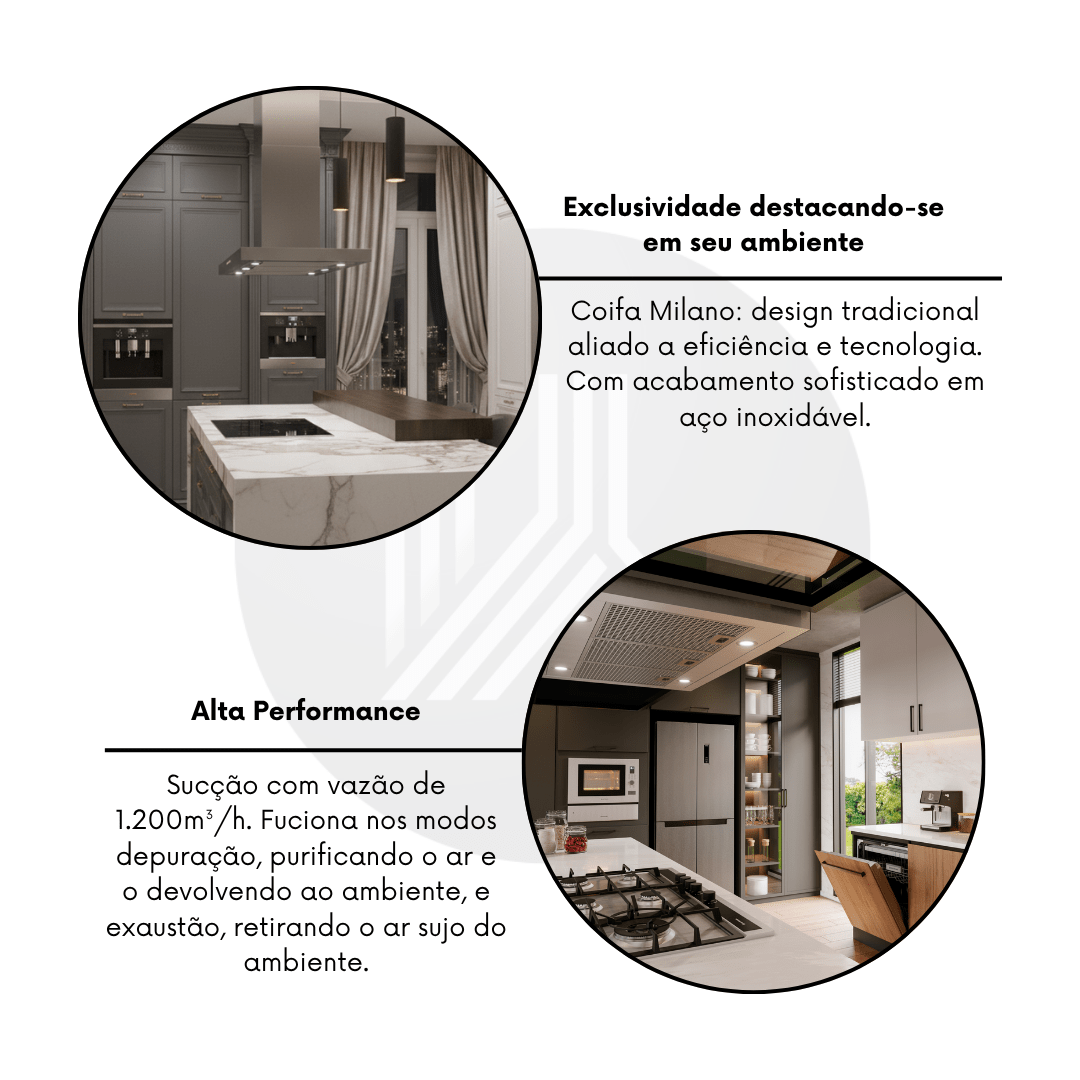 A Coifa de Ilha Elettromec Milano 120 cm é a solução ideal para cozinhas amplas com design em ilha, oferecendo ampla cobertura com seus 120 cm de largura. Seu design tradicional e sofisticado em Aço Inoxidável foi atualizado com um novo motor ainda mais potente, garantindo alta performance na eliminação de odores e vapores, com uma vazão de 1.200 m³/h.