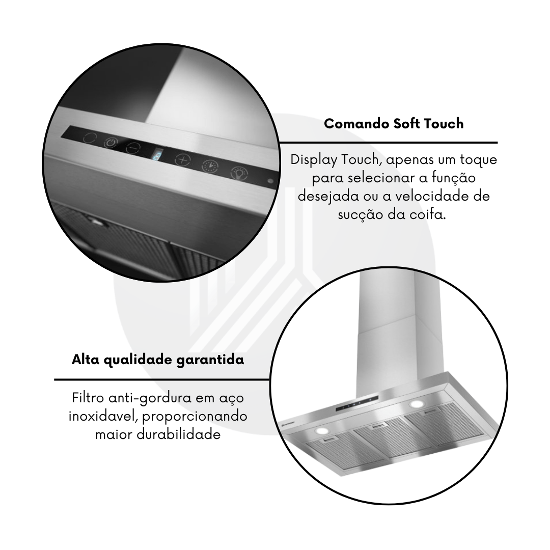 O controle é facilitado pelo novo layout do Display Touch, que permite selecionar todas as funções com um simples toque. O modelo é versátil, operando como Depurador (purificando o ar e o devolvendo ao ambiente) ou como Exaustor (retirando o ar sujo). Conta também com a Função Timer para programação do desligamento automático e uma iluminação em LED potente e econômica, que proporciona melhor visibilidade da área de cocção.