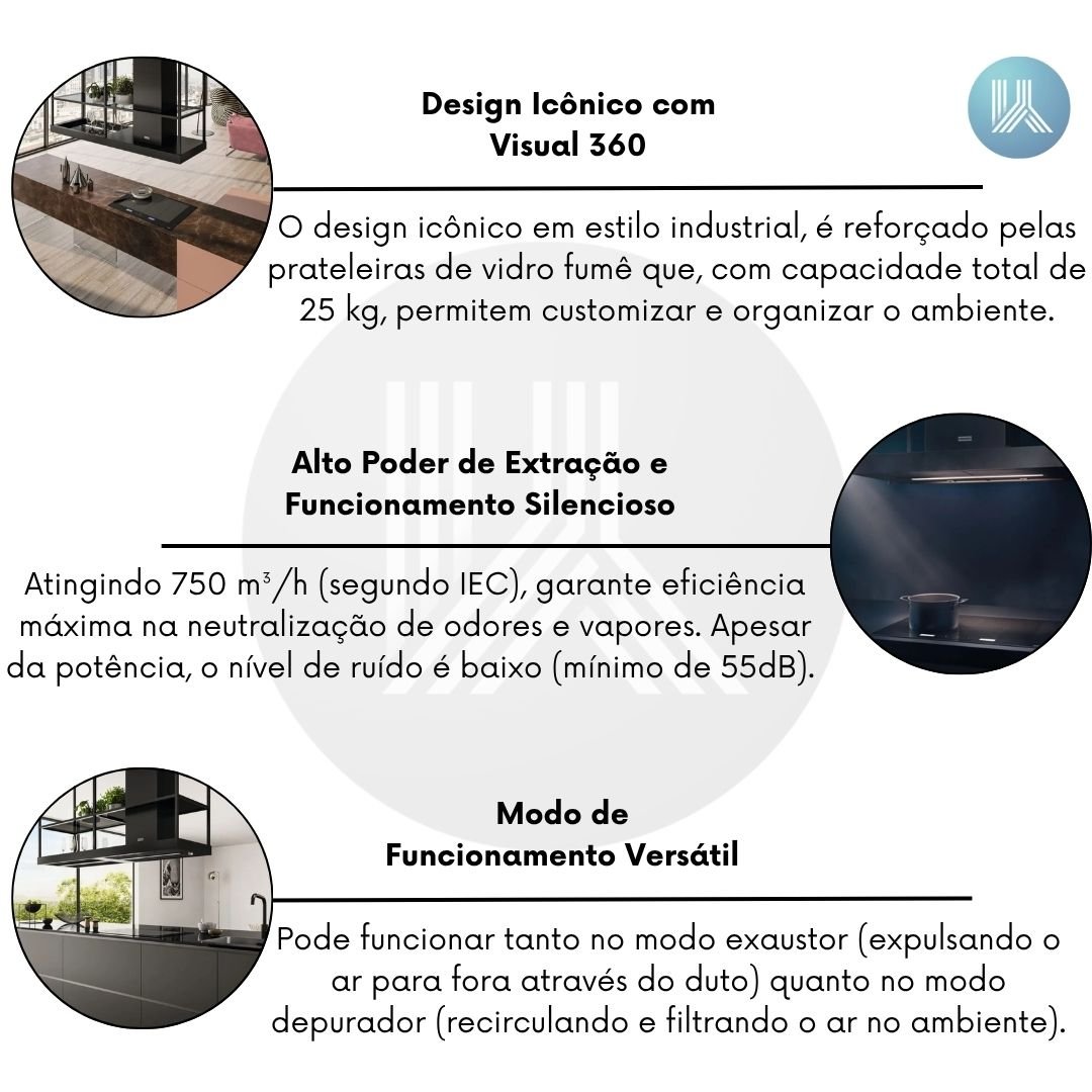 O design icônico da coifa, em estilo industrial, é reforçado pelas prateleiras de vidro fumê que, com capacidade total de 25 kg, permitem customizar e organizar o ambiente. O visual 360 graus é garantido pela posição simétrica da iluminação LED dupla, o que confere elegância à peça vista de qualquer ângulo na ilha da cozinha.
