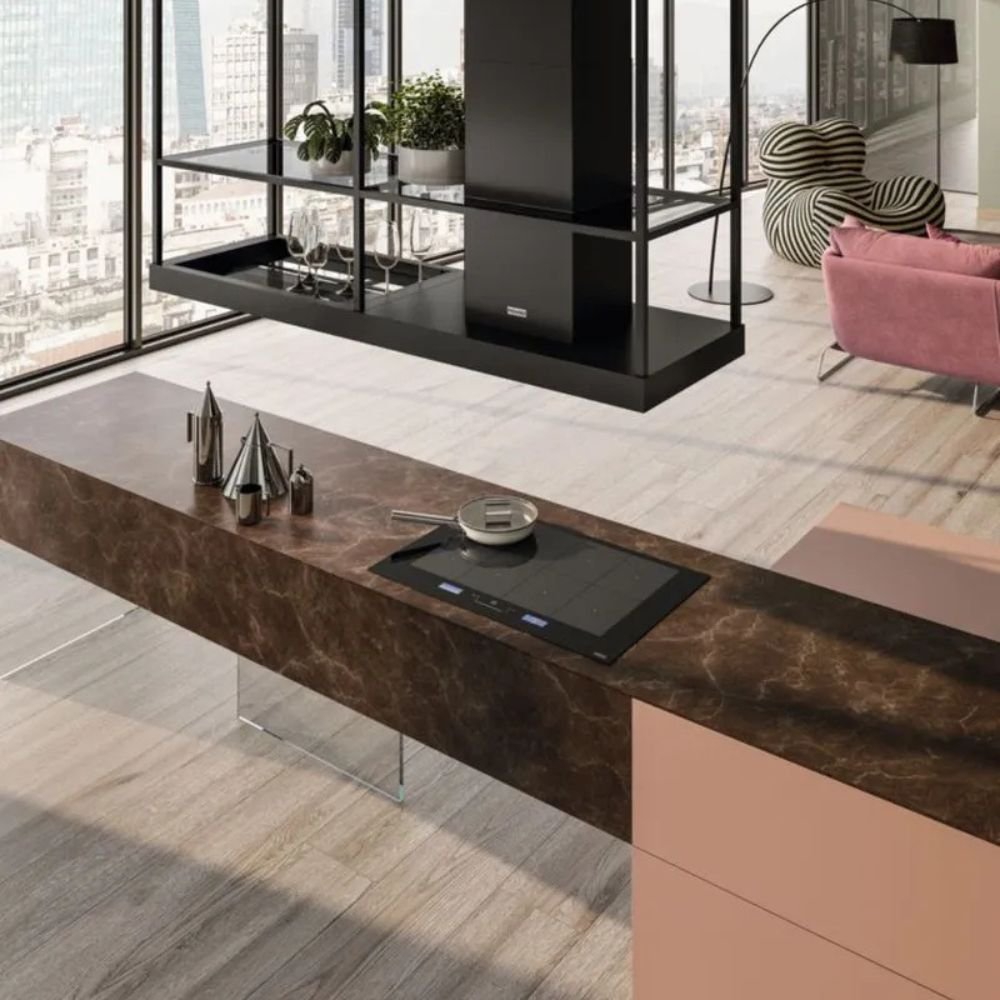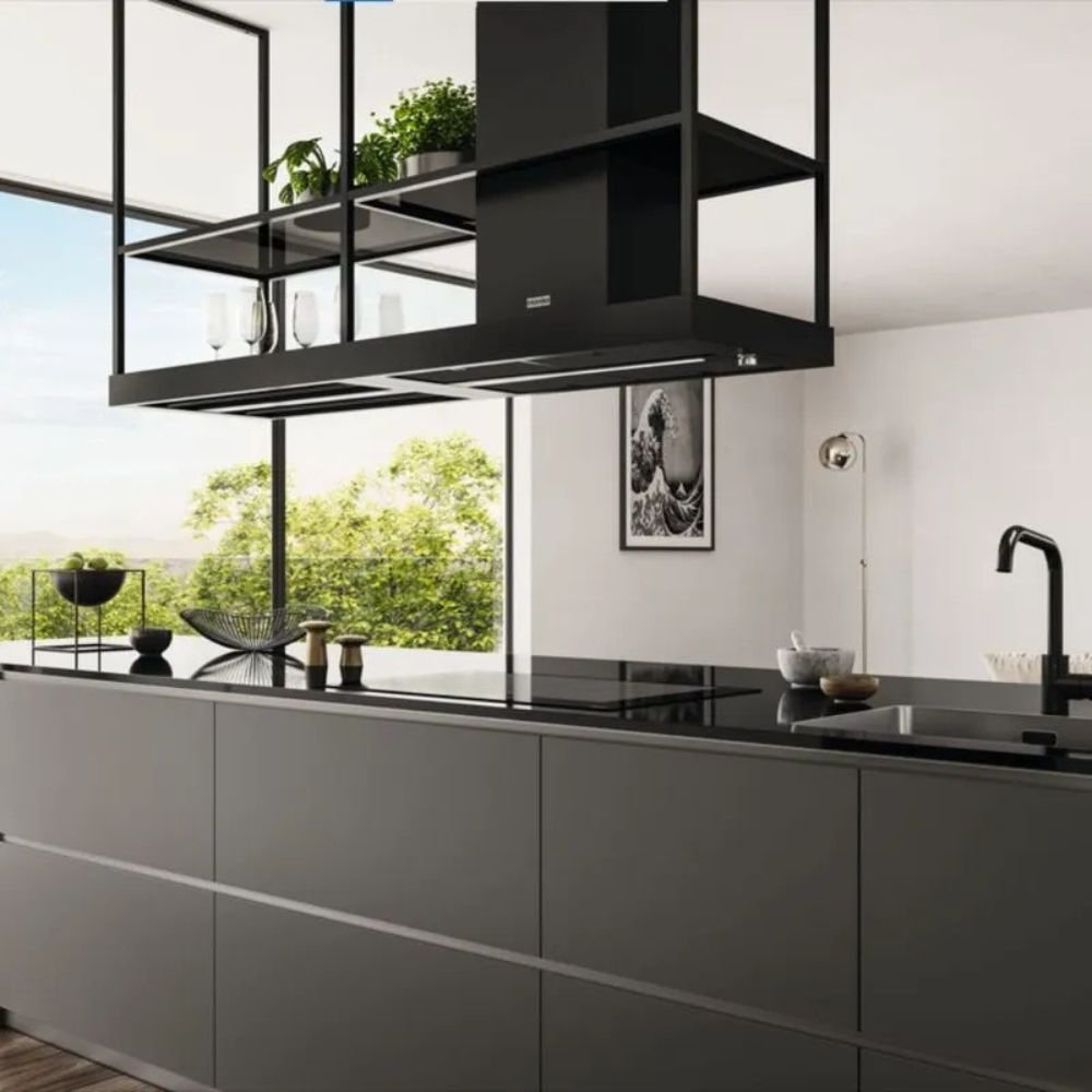 A Coifa de Ilha T-Shelf Franke é uma peça de design icônico em estilo industrial que agrega funcionalidade e beleza ao seu ambiente gourmet. Com 180 cm de dimensão total (coifa e prateleiras), ela surpreende com prateleiras de vidro fumê que combinam rigor e leveza em um visual 360, graças à posição simétrica das luzes LED duplas. O acabamento em Black Matte é elegante e atemporal, permitindo que a coifa não apenas extraia odores, mas também sirva como um elemento central de organização e decoração na sua cozinha.