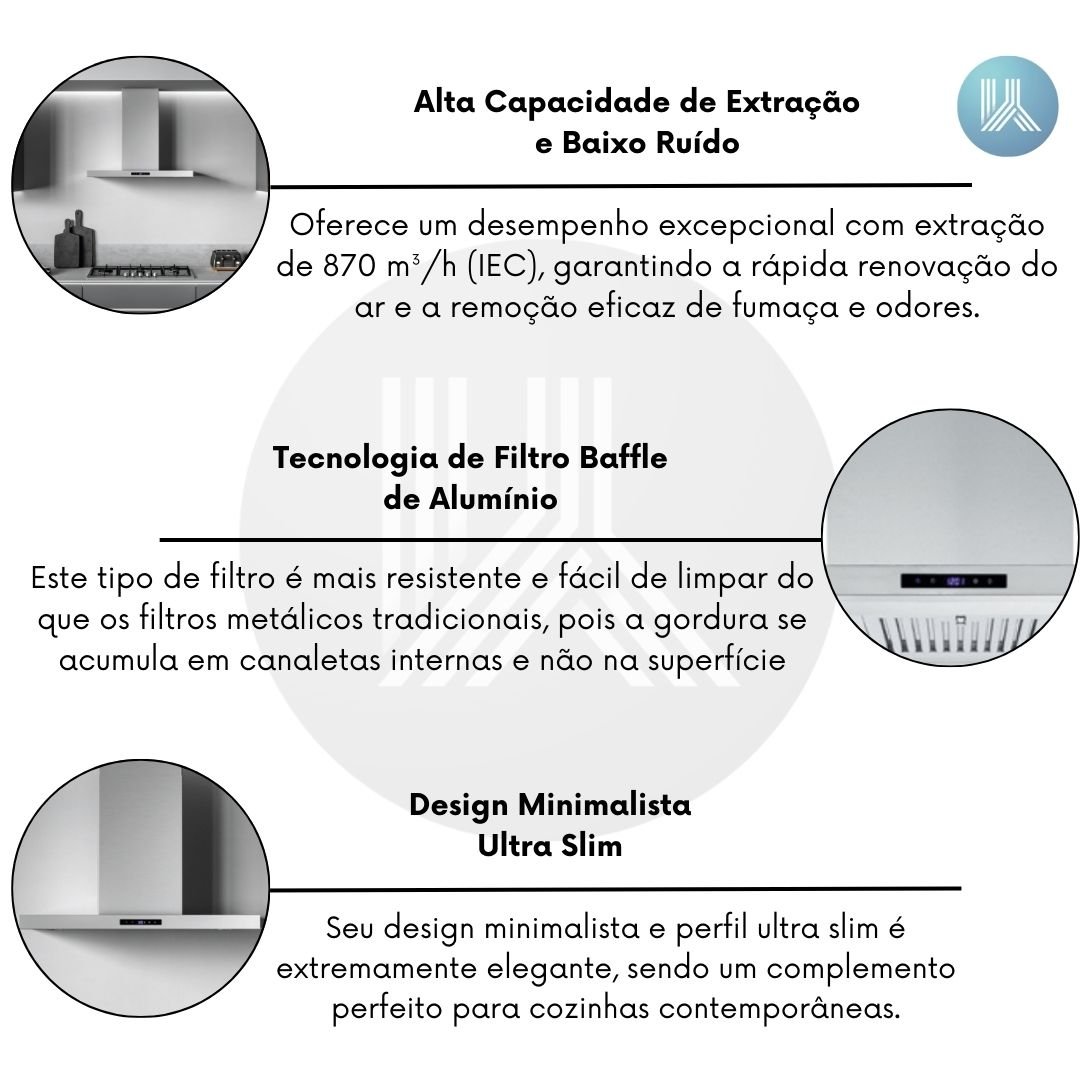 Um dos diferenciais é a tecnologia do filtro de gordura defletor Baffle de alumínio. Este tipo de filtro é mais resistente e fácil de limpar do que os filtros metálicos tradicionais, pois a gordura se acumula em canaletas internas e não na superfície, garantindo uma filtragem superior e maior durabilidade.