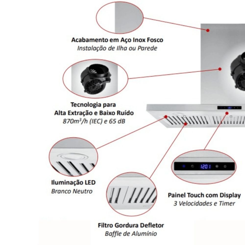O produto é de fácil manuseio através do painel soft touch com display e iluminação LED na cor branca neutra. Possui três velocidades de sucção e conta com a função Timer (Delay), permitindo que a coifa continue a operar por um tempo determinado após o preparo e se desligue automaticamente, garantindo a completa purificação do ar.