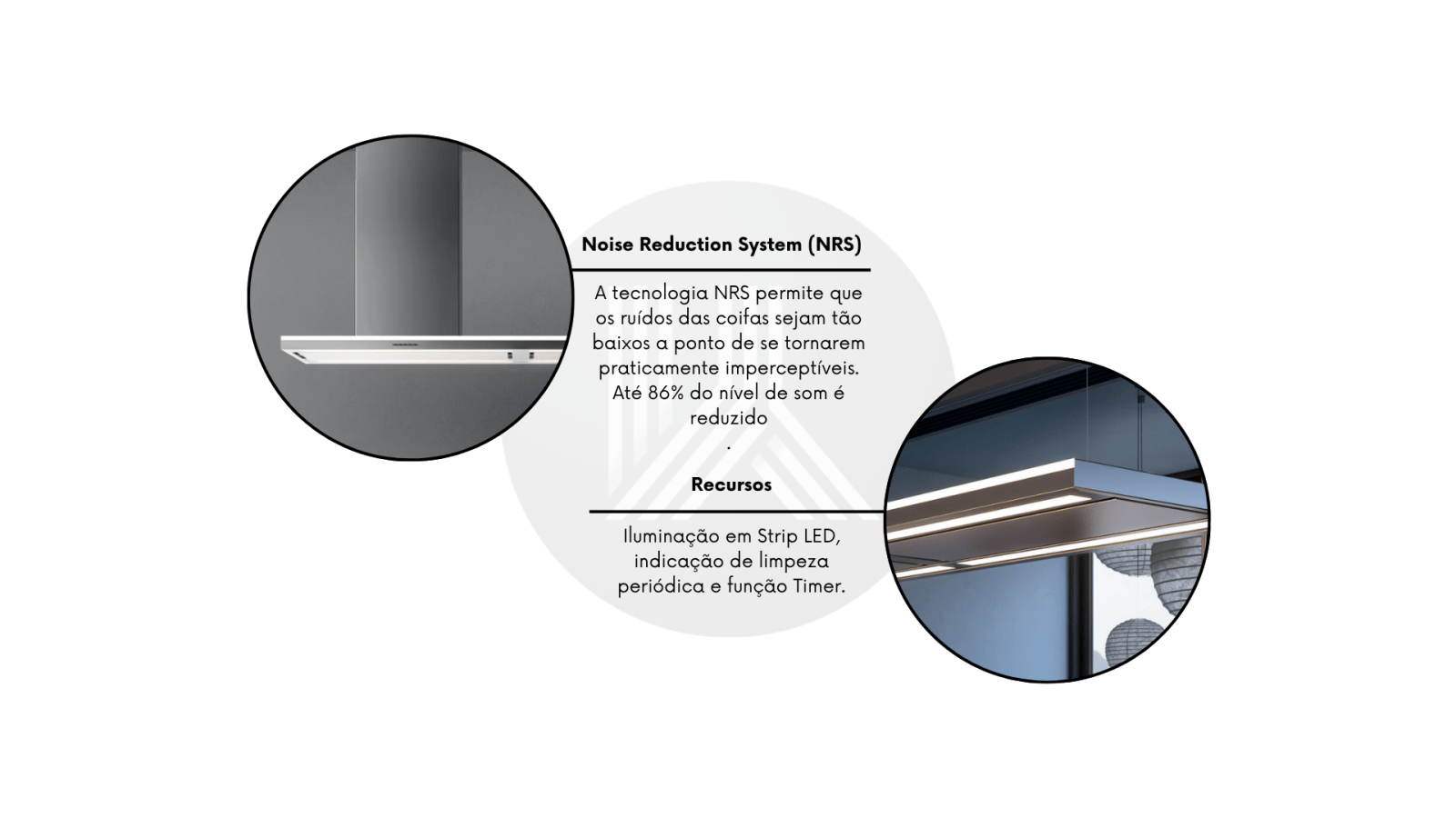 Desenvolvida com o exclusivo sistema Noise Reduction System (NRS), essa coifa reduz em até 86% o nível de ruído em comparação com modelos convencionais, permitindo que você cozinhe, converse, ouça música e viva sua cozinha de forma plena e confortável.